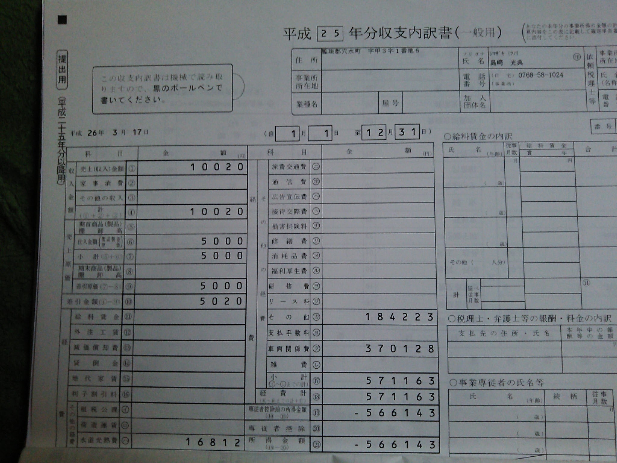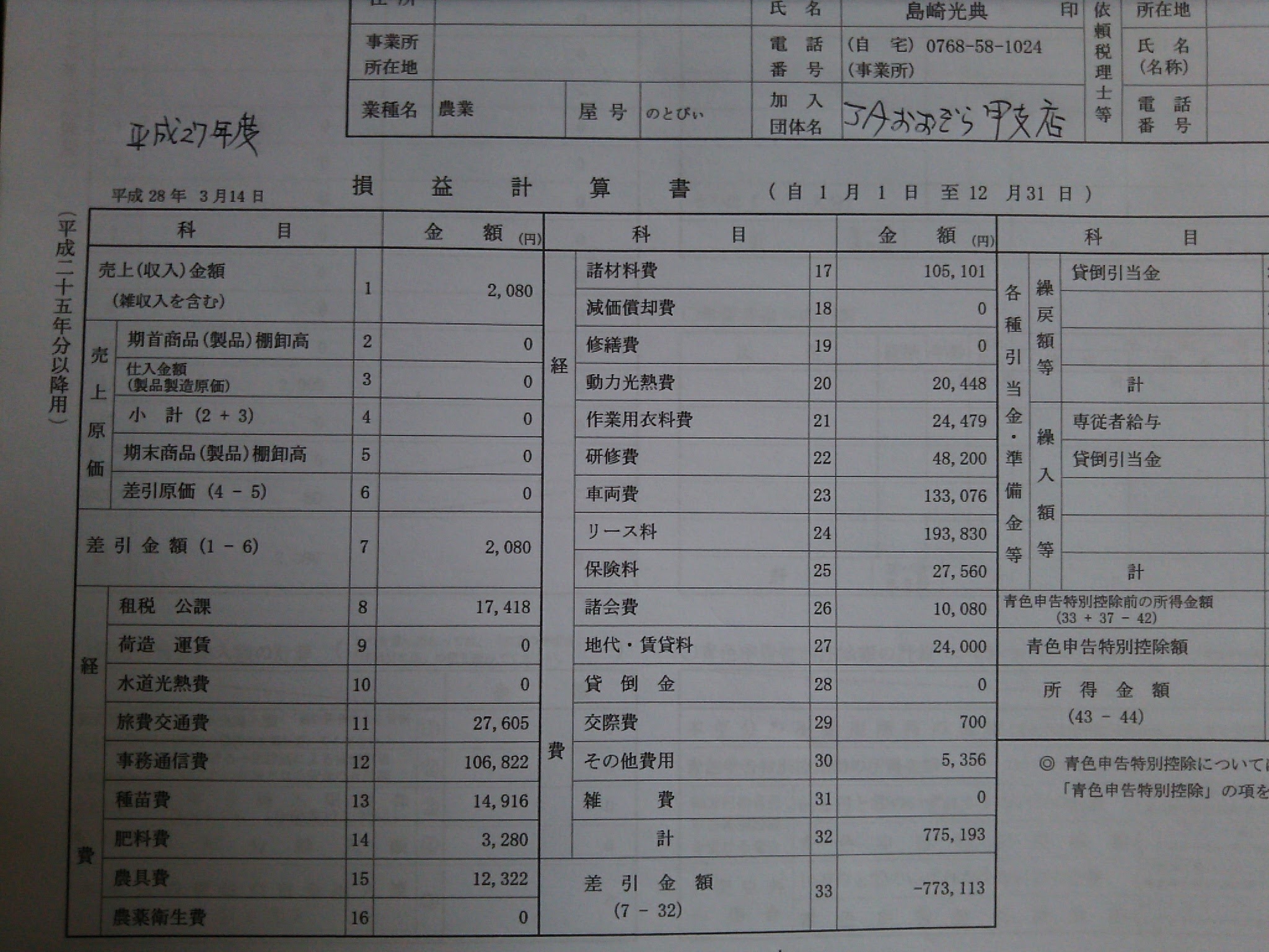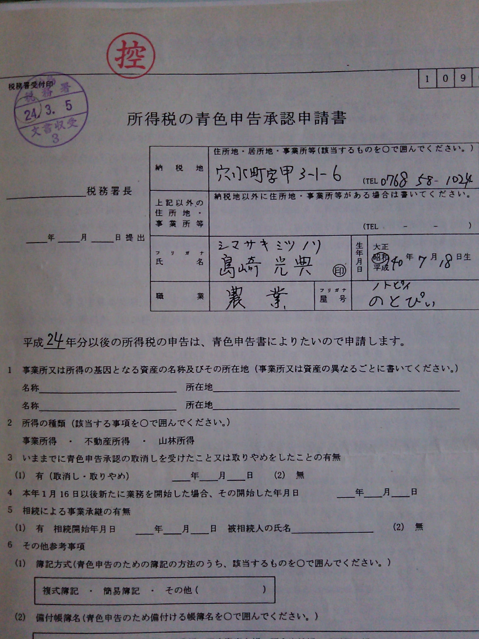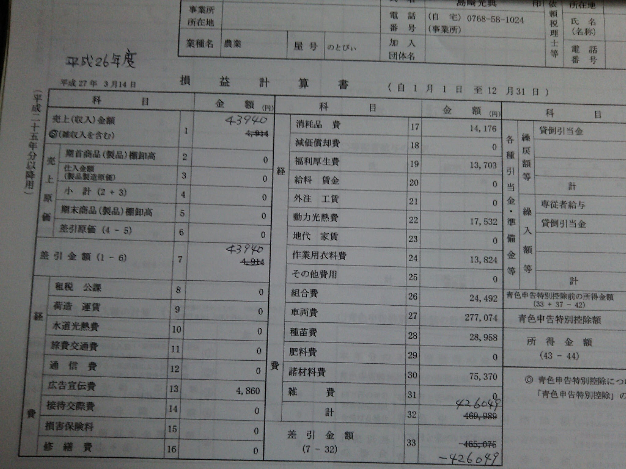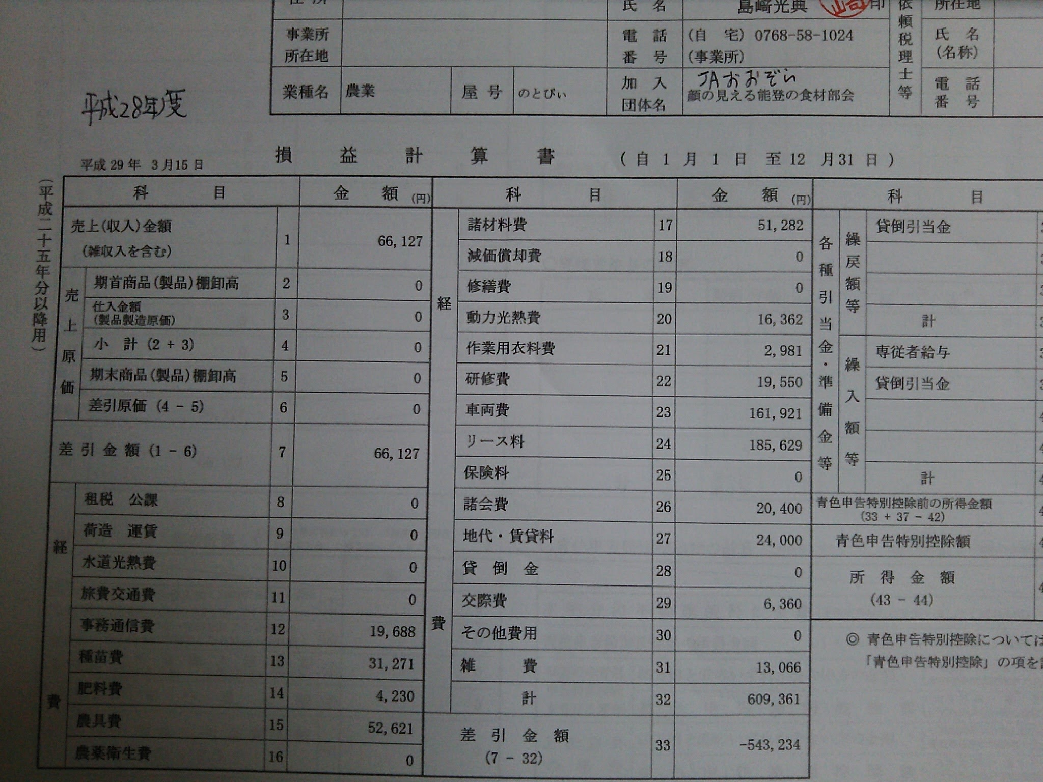 輪島税務署に個人事業主として開業届を出したときに屋号を記入する場所があったので、「のとぴぃ」としました。青色申告も届け出ているので決算書類を作成する必要があります。普通は自分で作成した決算報告書を税理士に確認してもらって税務署に提出します。私の場合は農業所得がほとんどありません。ですから還付金を受け取るための申告になります。使った必要経費の内訳を領収書をノートに貼りつけてパソコンの青色申告ソフトで簿記の要領でまとめて税務署で見てもらいました。1年目は「新エクセルで農業青色申告」という本についてきたソフトを利用しました。