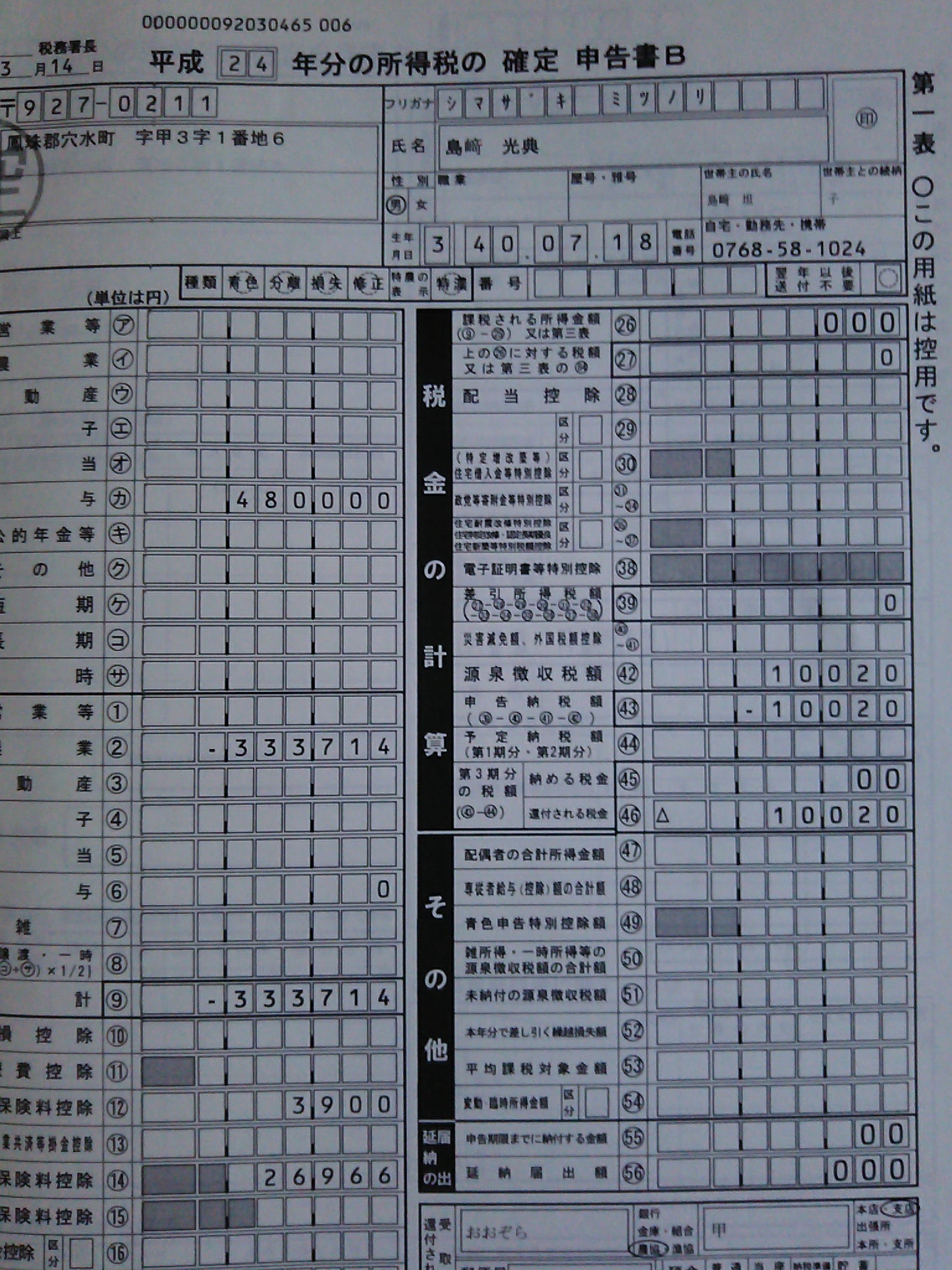 その年の確定申告は翌年の2月15日から3月15日までにするので、2012(平成24)年度が最初の確定申告です。この年は給与収入と合算して申告しました。