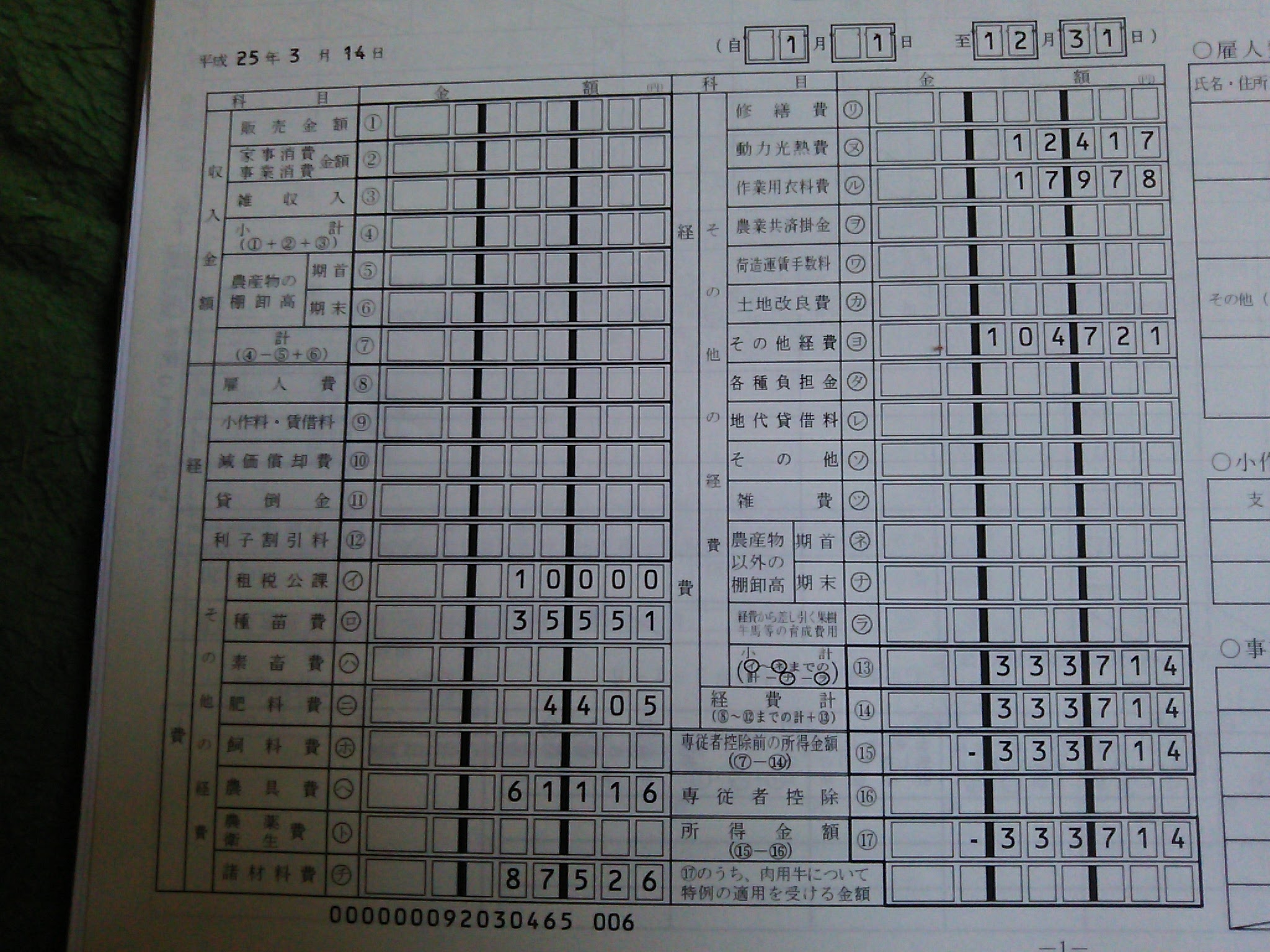 2013(平成25)年度分からは「ソリマチのみんなの青色申告」を使っています。このソフトは農業会計用のソフトでないので、科目を農業用に修正して決算書を作っています。そうなると確定申告書についている農業用の書類は使えませんが、税務署の方が申告内容に間違いがなければこれでもいいと言ってくれたので、今もこのソフトを使っています。