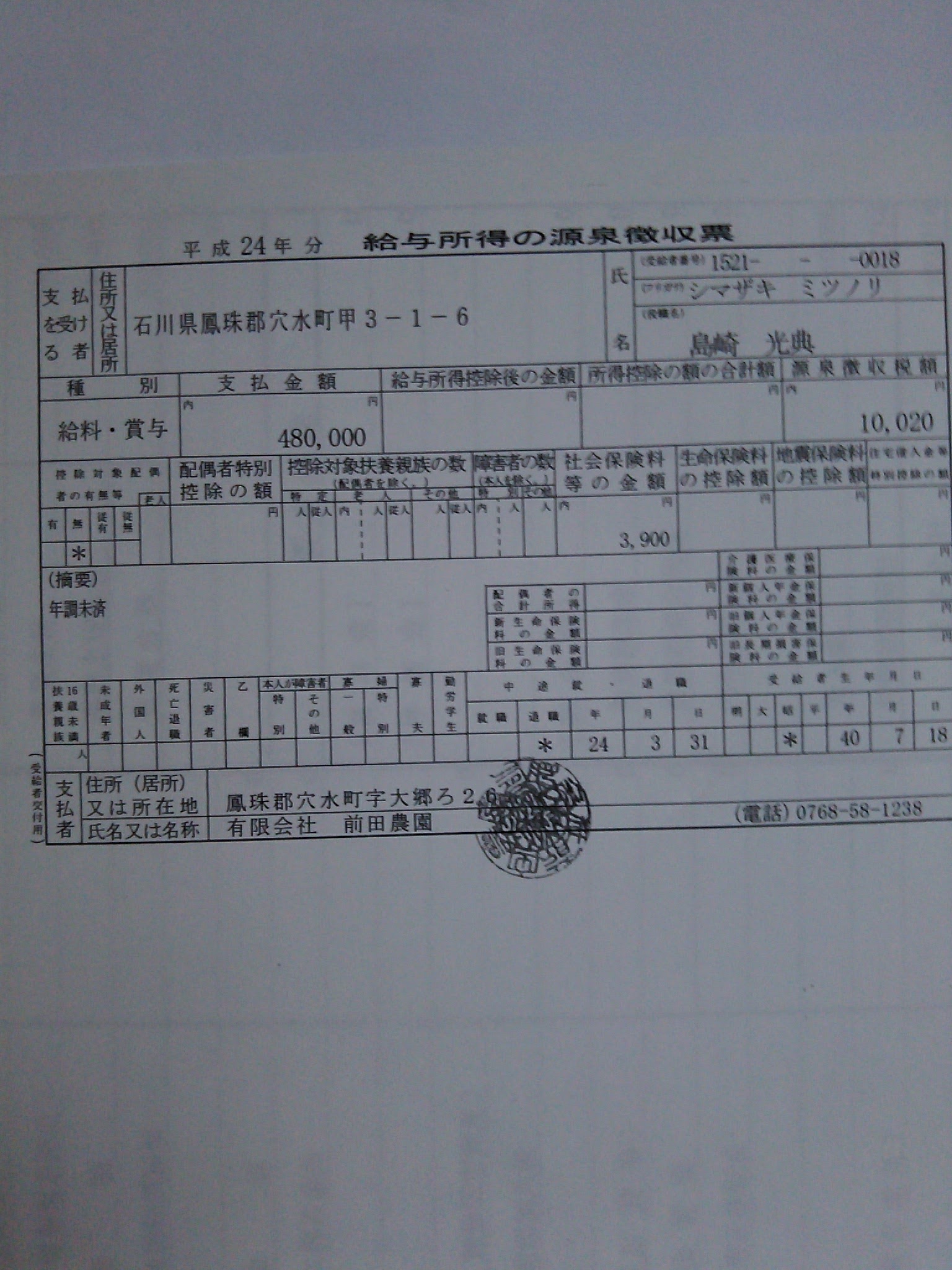 2011(平成23)年4月から2012(平成24)年3月まで穴水町の前田農園で農業実習をしていました。2012年1月から3月までの3か月分は月額16万円の給与をもらっていたので、その分が給与所得になります。そしてこの給与は「いしかわ農林漁業人材雇用創出事業(農業分野)」の助成制度から出ていました。
