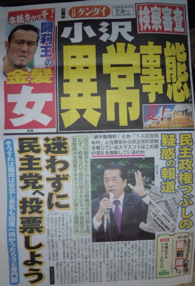 そして現在の総理大臣をよいしょしないで9月の民主党代表戦で総理大臣に就任するつもりの小沢一郎を今からよいしょしまくる「日刊現代」というエロとギャンブル大好き馬鹿オヤジご用達の夕刊紙の主張も危険きわまりないと思う。