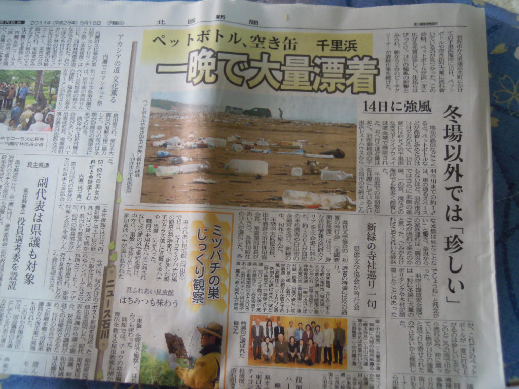 5月16日の北国新聞で石川県の千里浜に大量のゴミが漂着した記事がありました。