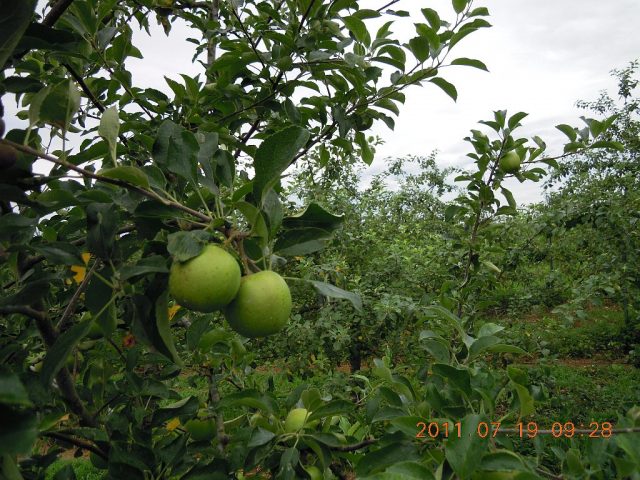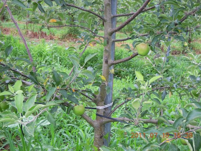 7月19日 りんご園のりんごの実が1つの株から2個以上ついているものを切ってました。それは別にして「にいにぜみ(だと思う)」がたくさんりんごの木にとまってました。
