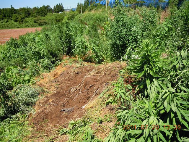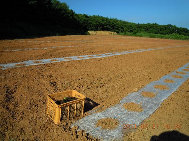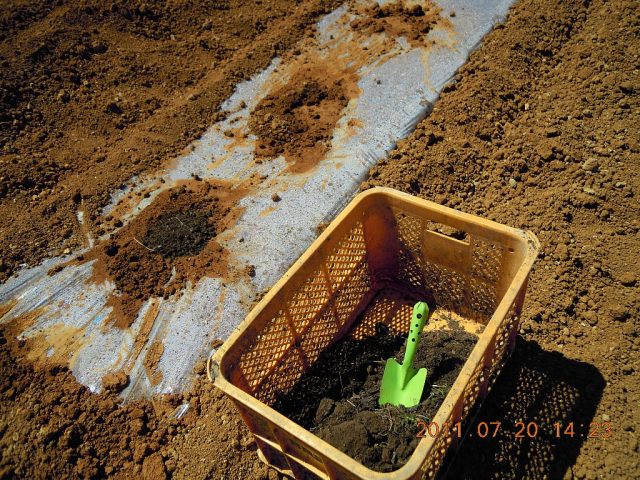 7月21日 昨日の続きでかぼちゃの種を植えた土の上に腐葉土をかぶせてました。