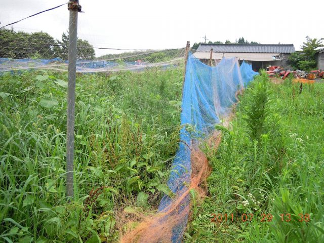 7月27日 午前中は昨日の続きで、杭を立てて動物の侵入用の電気柵を作りました。