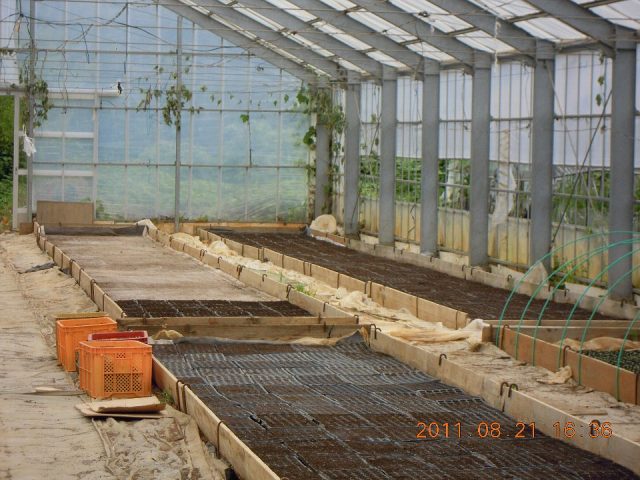 8月21日 2人でハウス内の掃除と片付け。それが終ってからセルトレーに土を入れて並べた。