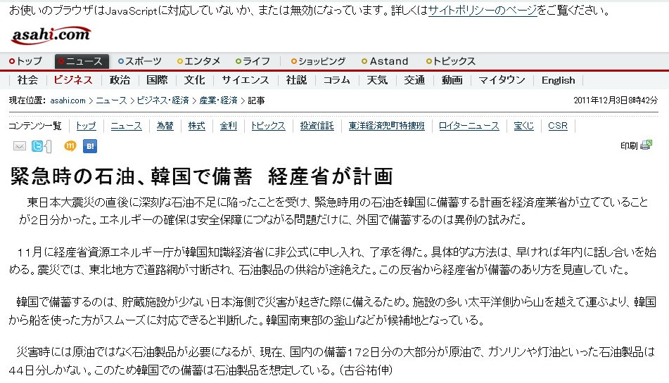 [asahi.com 緊急時の石油、韓国で備蓄 経産省が計画](リンク切れ)