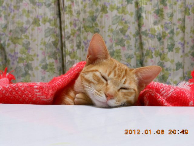 最初は寝顔を撮りました。起きてからこたつの上にあった缶ビールに興味をもったので様子を見ていたらふちをなめ始めました。写真には撮ったけど次に缶ビールに近づいたら頭を叩きます。