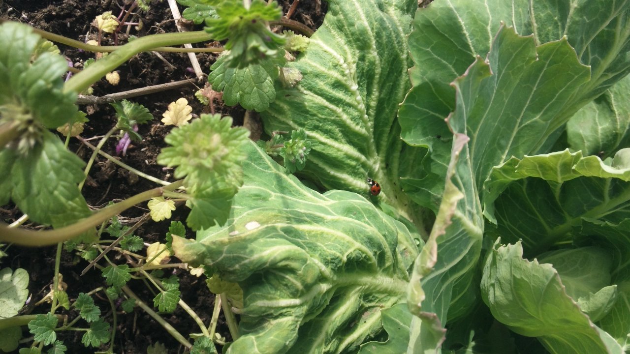 刈敷きをしているキャベツにてんとう虫がいました。