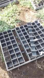 3.育苗トレイに入った苗を穴の中に置いていきます。
