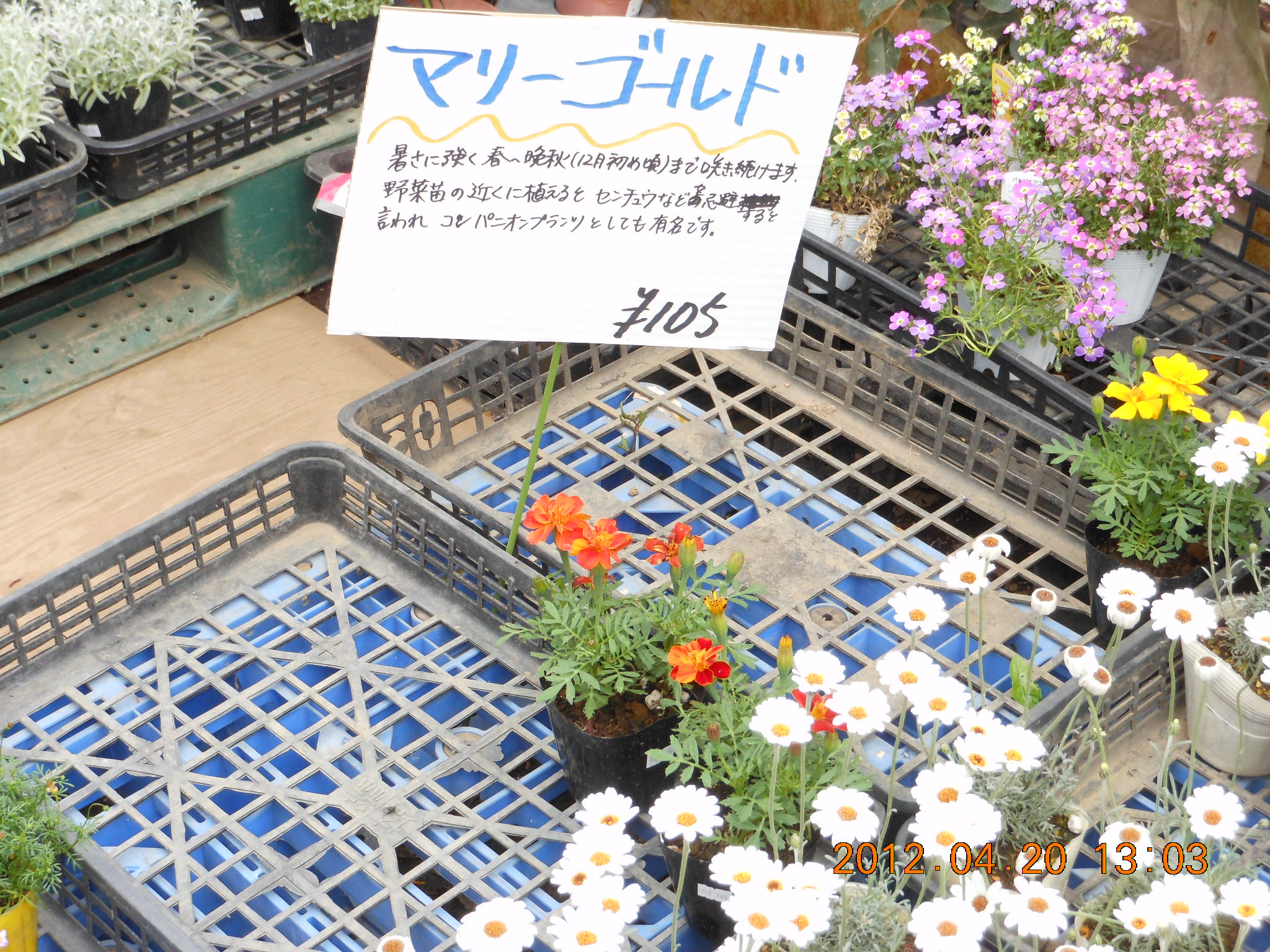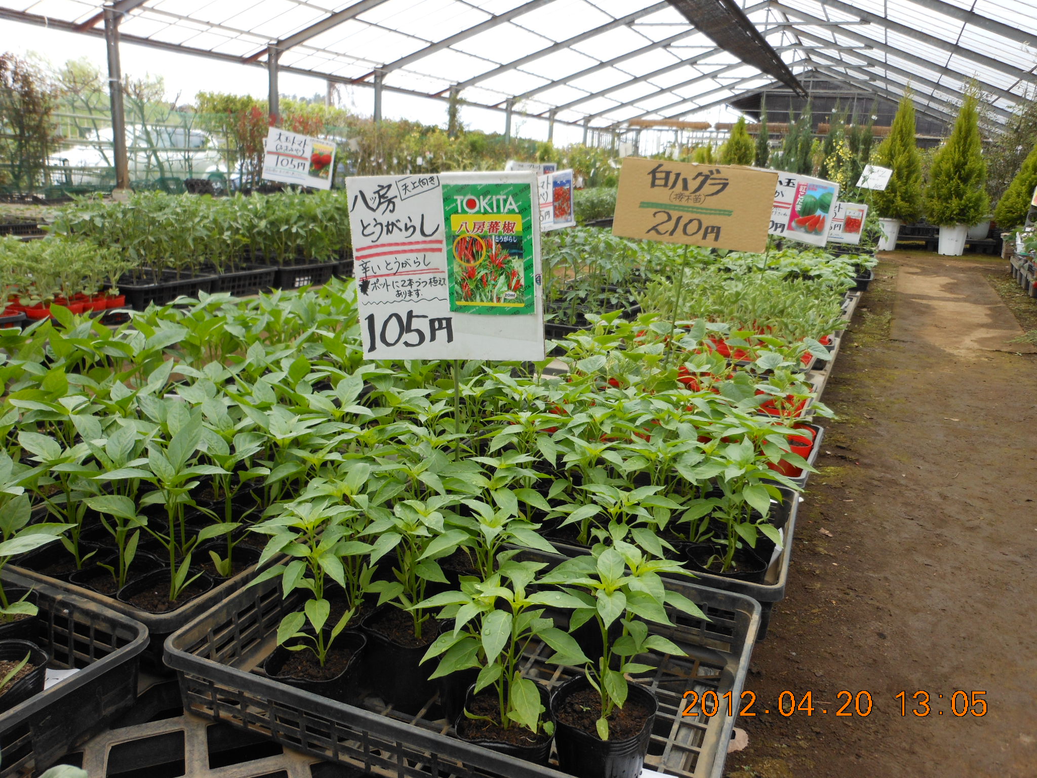 2012年4月20日 / 最終更新日時 : 2019年9月9日 shimasakimitsunori 日本農業実践学園 みずほの村市場筑波本店 2012-04-20 「食と農の科学館」を早めに出たので12時過ぎには到着しました。 花と野菜の苗を売っている場所に「くじゃく」がいました。 こちらの直売所はJGAPの認証を受けています。 それで花と野菜の苗を買ってきました。 花は「マリーゴールド」と3種類の「タイム」です。 野菜はとうがらしの「八房」です。 どれも虫除けに効果があると思いました。 それでナスの苗のそばに置いておけば虫がつかないかも? と単純に考えました。 あとはどうやって持って帰るかです。 FacebookXBlueskyHatenaCopy