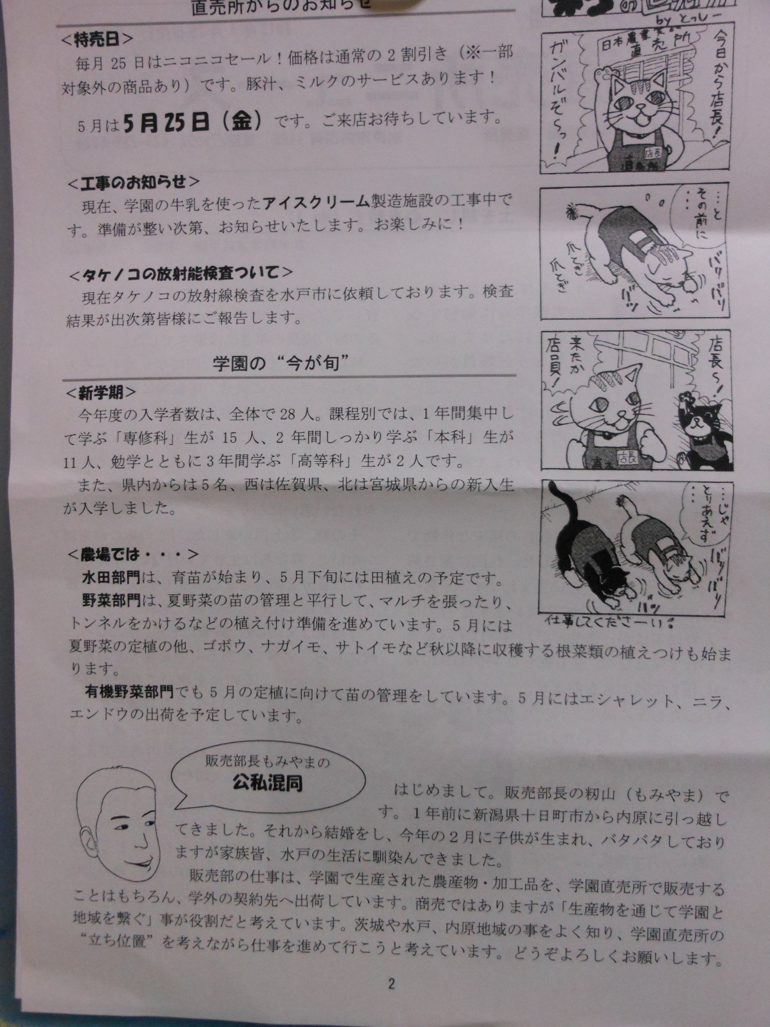 2012年4月26日 / 最終更新日時 : 2019年9月9日 shimasakimitsunori 日本農業実践学園 実践学園の直売所 2012-04-26 アイスクリームの製造工場を新設してます。 ちょうど今は野菜の苗も販売しています。 学生教育の中で作っているので業者さんと違って コストをあまり考えていません。 ちょっと気になる苗があるので買って帰ることにします。 最初の写真の直売所ニュースの表面は学園長の一言でした。 FacebookXBlueskyHatenaCopy