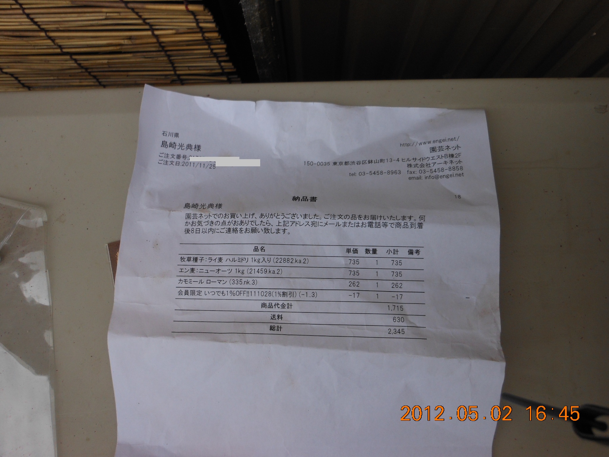 2012年5月3日 / 最終更新日時 : 2019年9月9日 shimasakimitsunori 日々是好日 緑肥用えん麦 2012-05-03 去年の11月に買っておいたニューオーツの1キロの袋ですが 昨日見たらねずみにかじられていました。 それで全部をかぼちゃの畝の間にまきました。 「はるみどり」というライ麦の袋は無事でした。 運良く畑が見つかれば緑肥として試してみようと考えてます。 ちょうど今はゴールデンウィークなので探すのは開けてからになりますが、 私はこっちに戻ってきて日が浅いので地域の事情に疎いです。 それで親父にも頼みました。 あとは地元の消防団の関係者にも相談してみるつもりです。 #ニューオーツ #ハルミドリ FacebookXBlueskyHatenaCopy