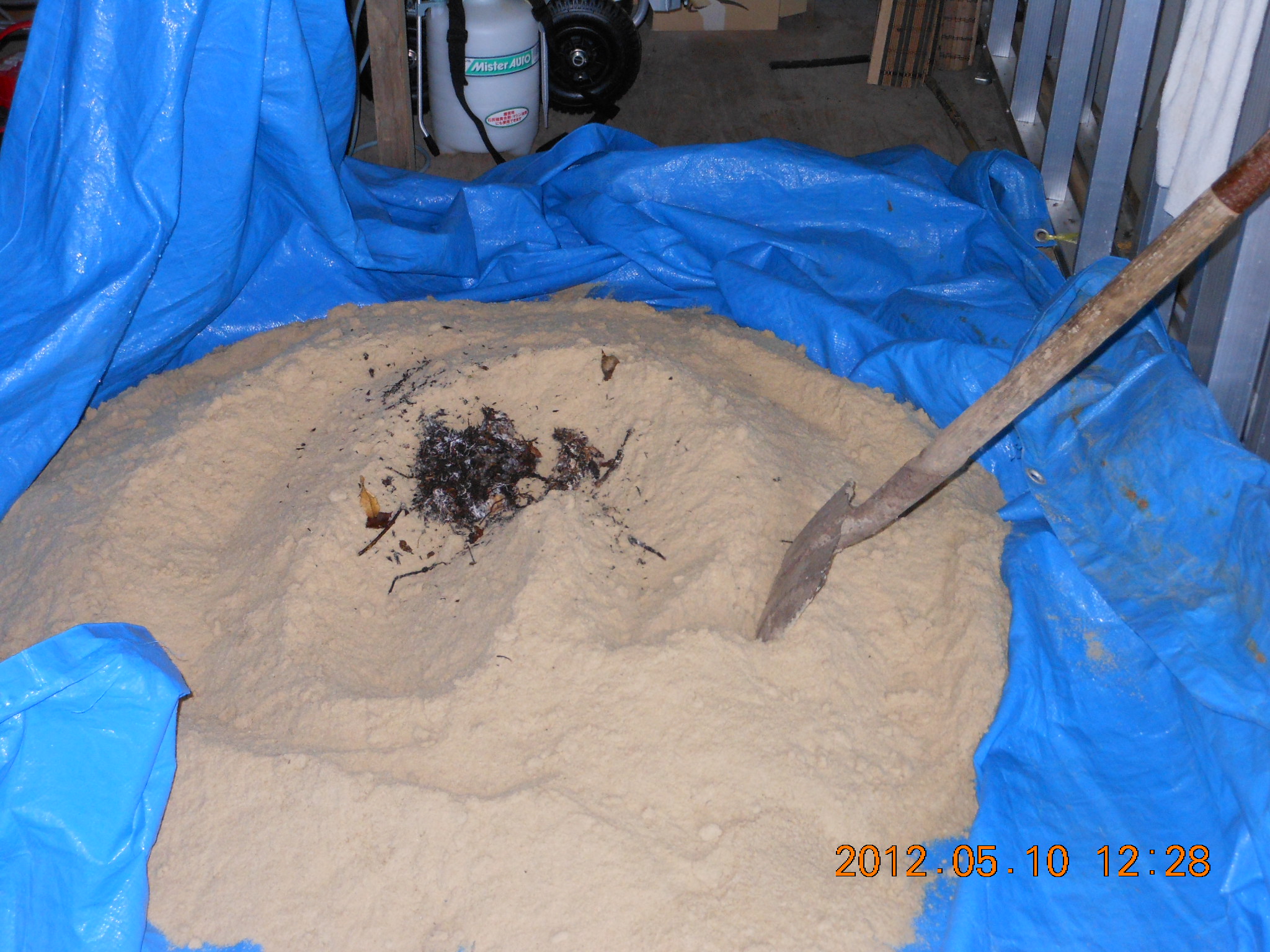 ブルーシートを傷つけないようにスコップで丁寧にかき混ぜます。