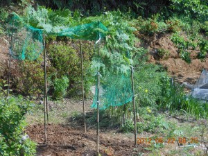 竹の支柱に廃品利用のネットをかけて