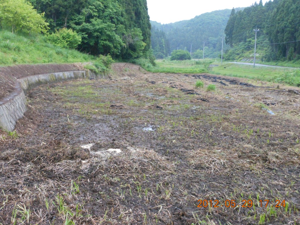 右下の田んぼは一段低い場所にあって水がたまりやすいのでビオトープにします。