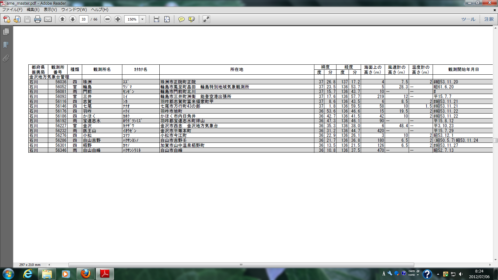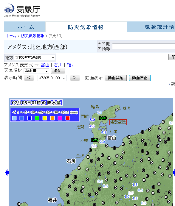 それで石川県内のアメダスの観測地点をマップ上に書き込みました。