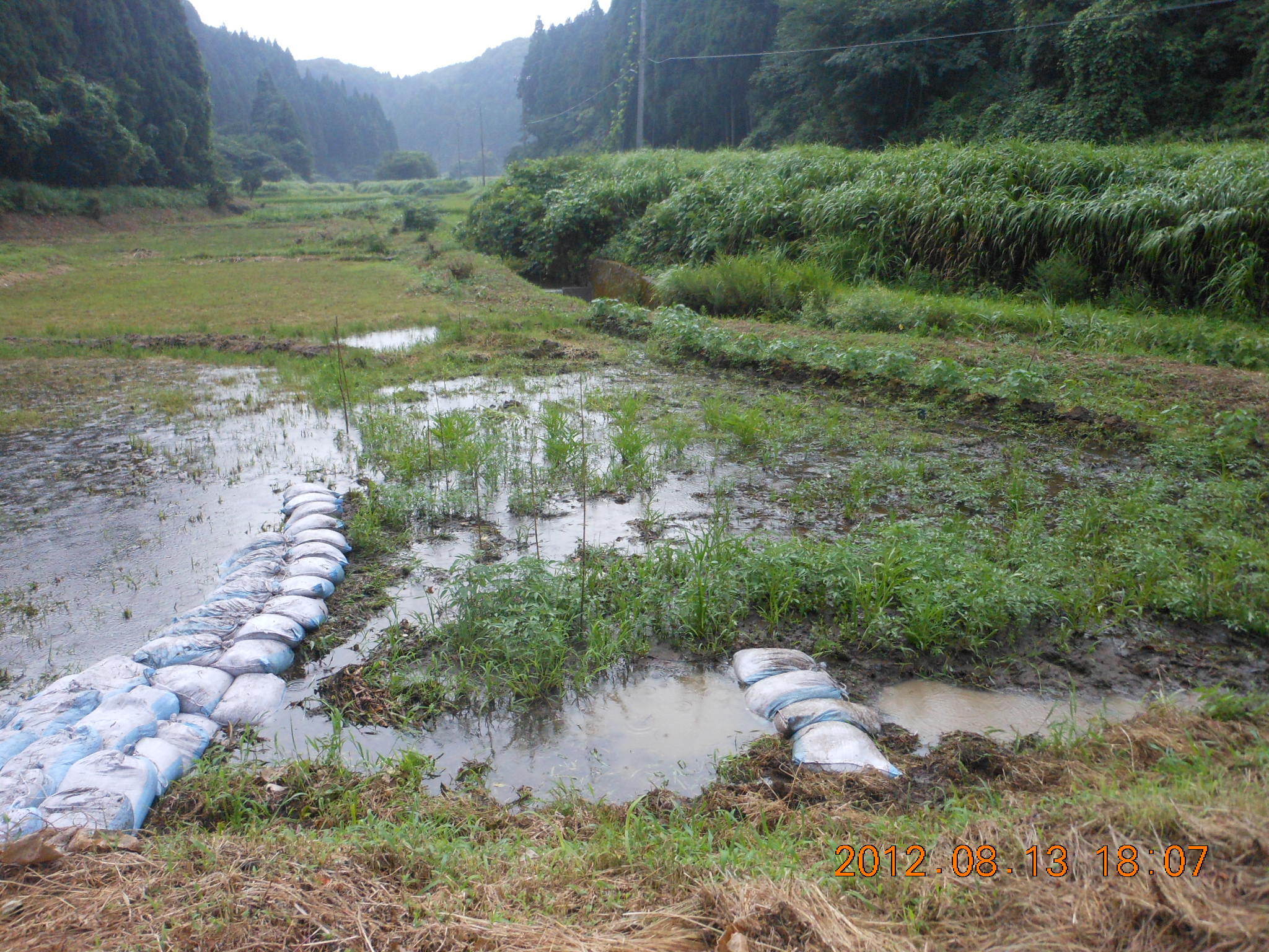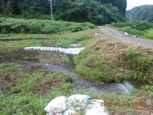 雨の晴れ間を利用して1号圃場で土のうを積んでました。