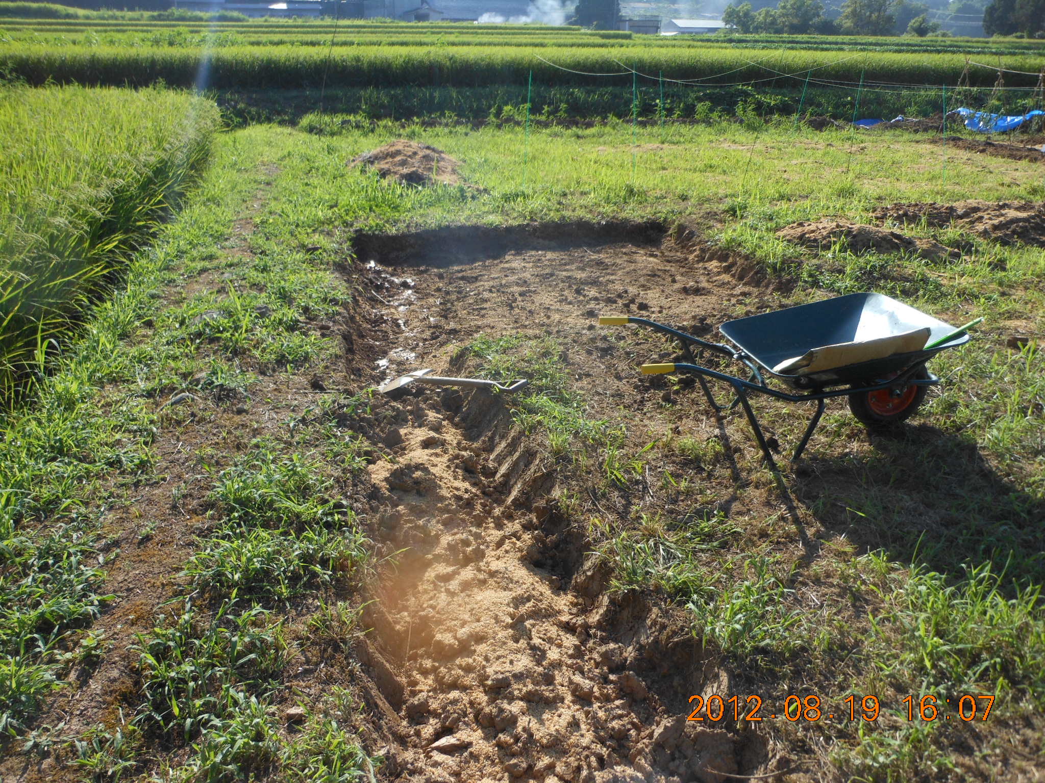 午後から3号圃場でもみ殻くん炭を作る場所を作ってましたが・・・・暑い。
