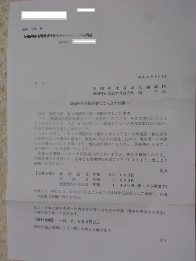 靖国神社崇敬奉賛会から入会案内が届きましたが
