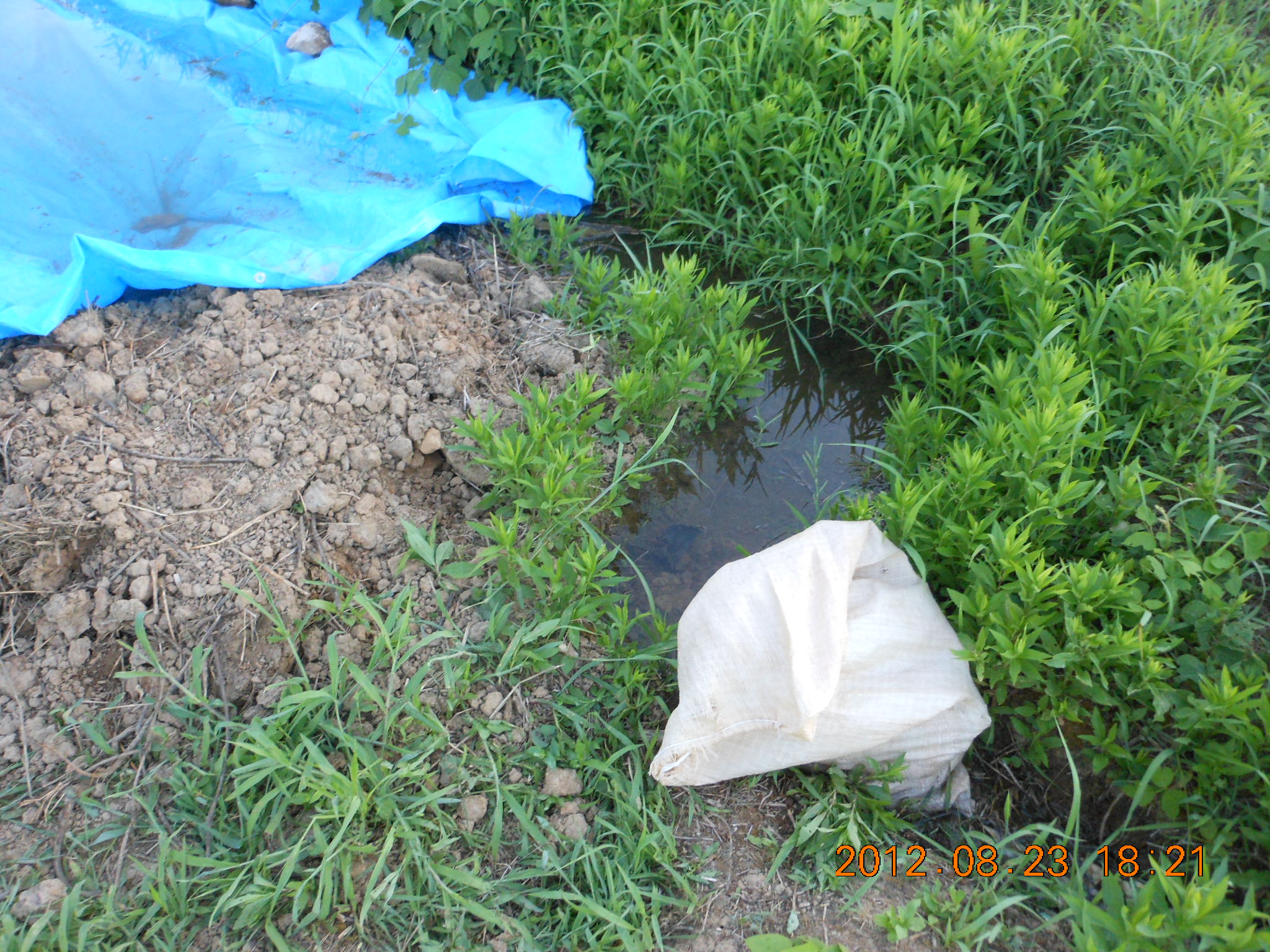 私が排水用の溝を土のうでせき止めたためです。