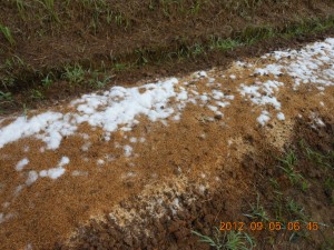 早朝3号圃場に行ったら、畝の上が白くなってました。