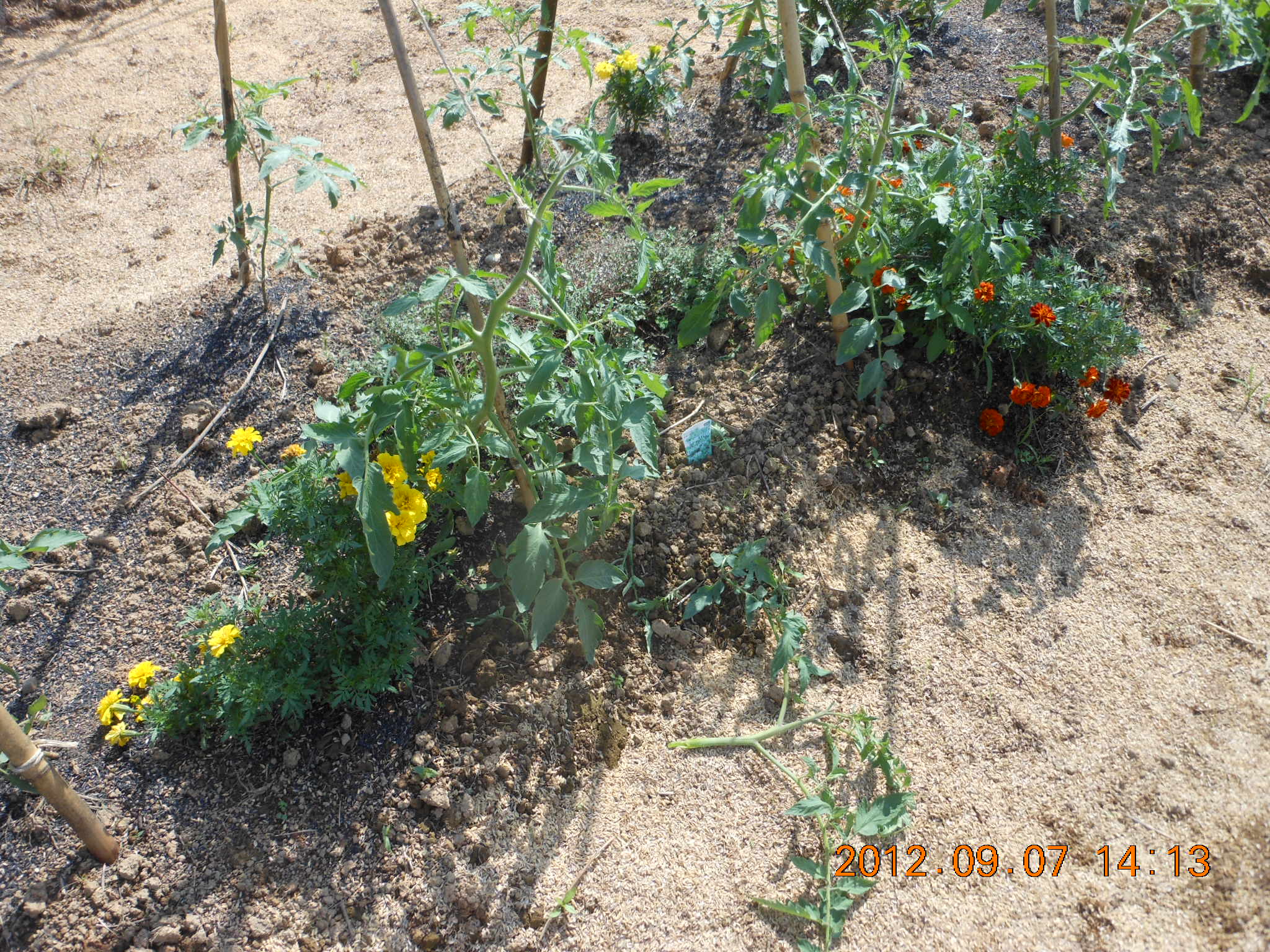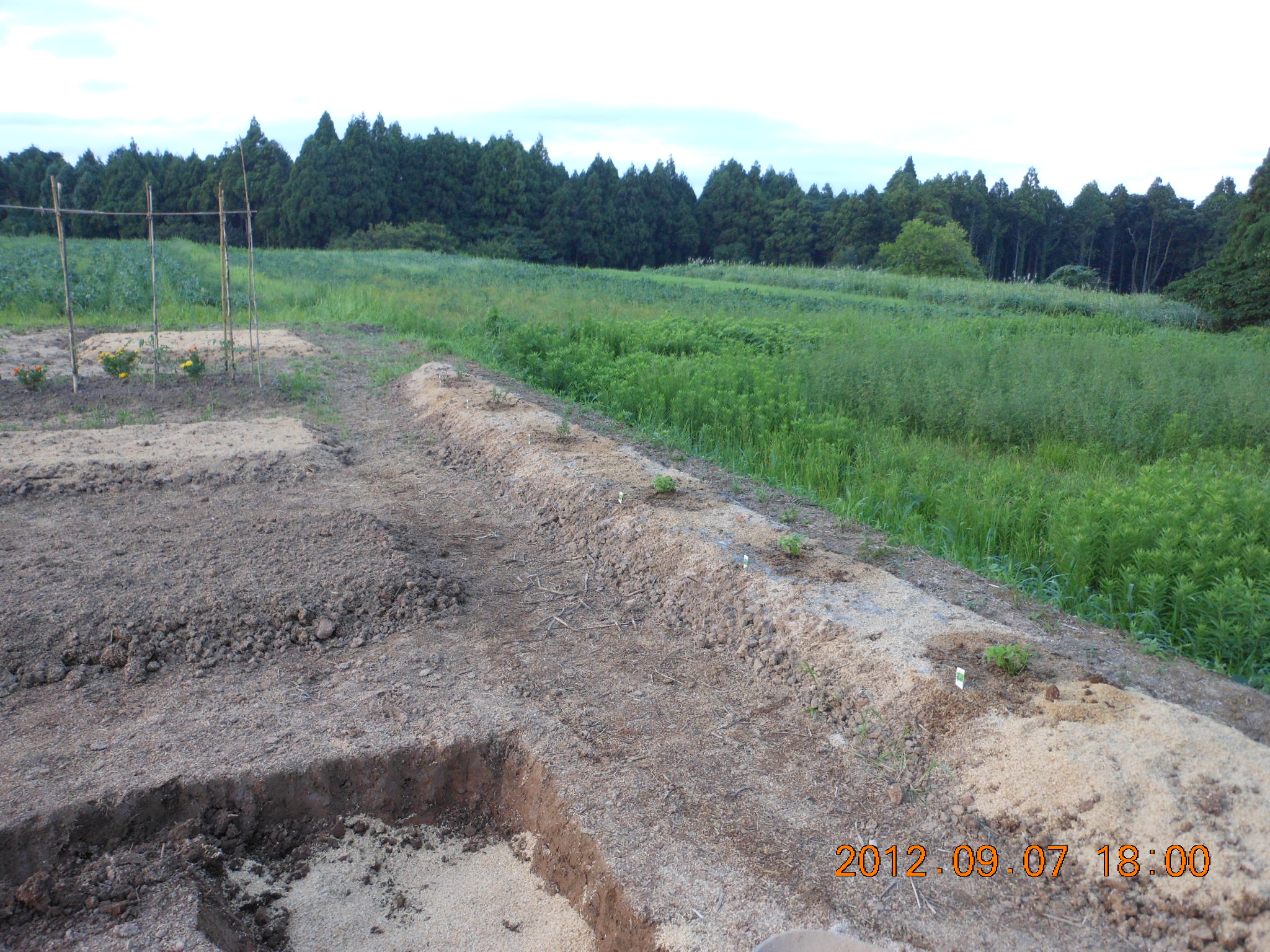ハーブ用の畝に通路と畝のそれぞれ中央にくるような間隔で並べました。
