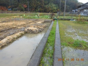 一輪車を持ってきて排水口の泥さらいをしてました。