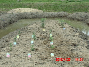 育苗用のカゴトレーを逆さにして水に沈めてダンポール支柱で固定させました。