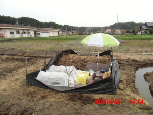 保温用にべたがけ不織布をトンネル支柱にかぶせておきました。
