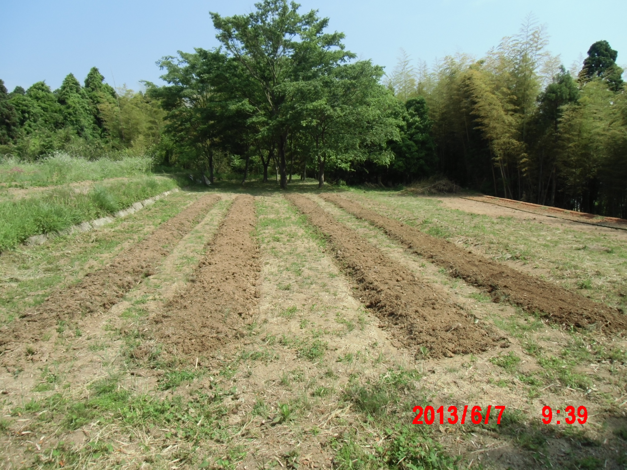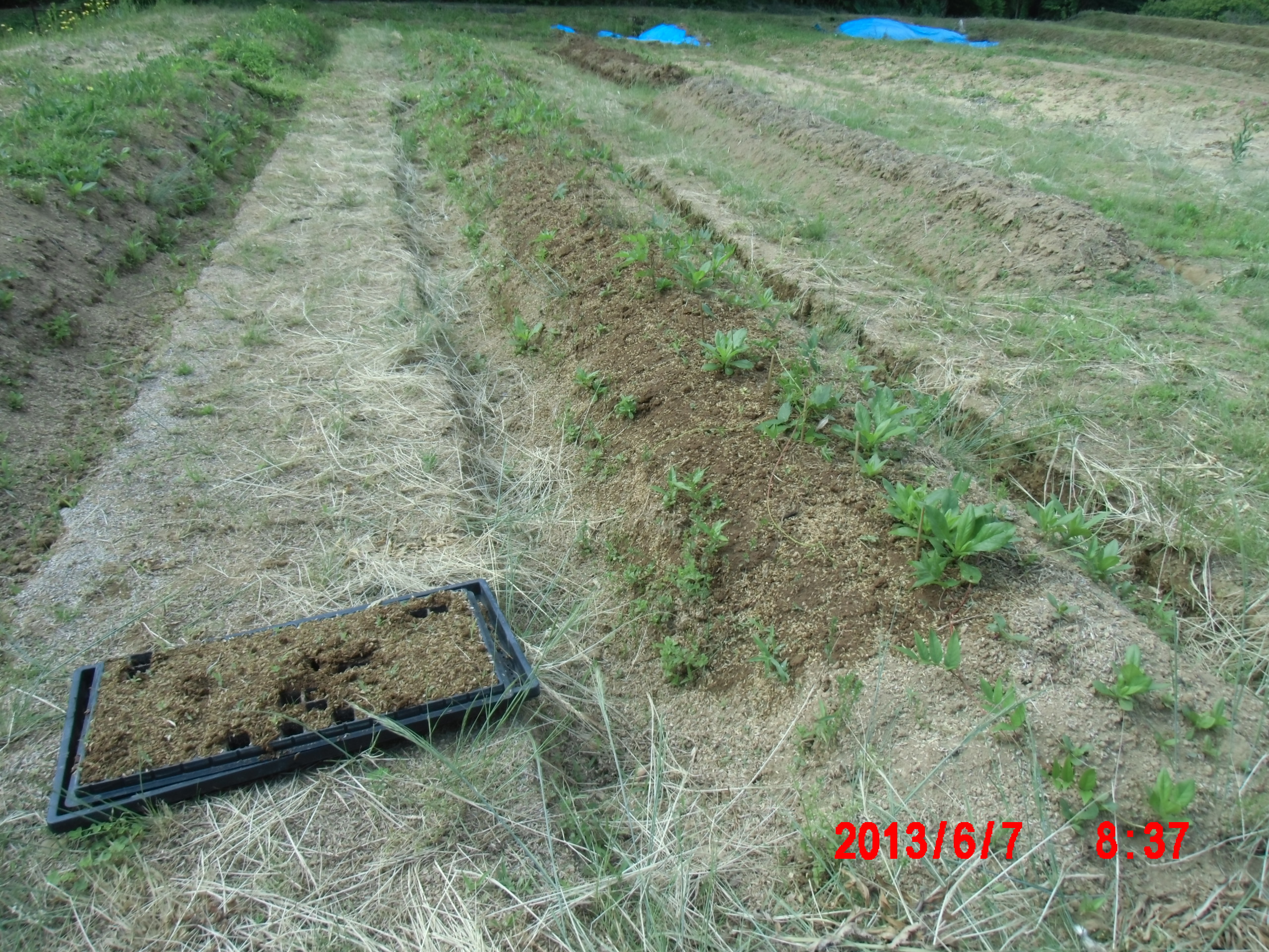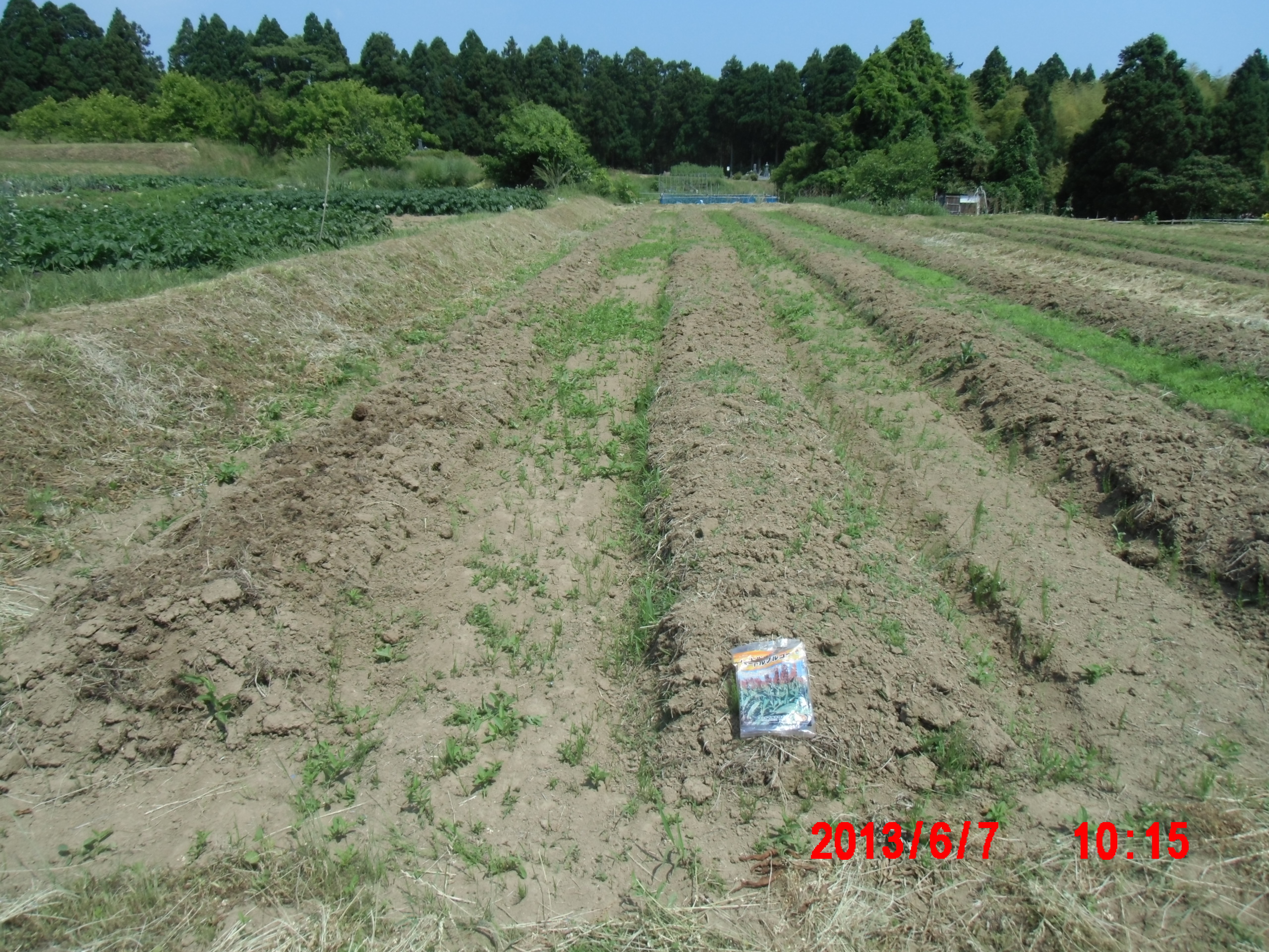 畝の西側に1列30センチくらいの間隔で4~5粒播きですが
