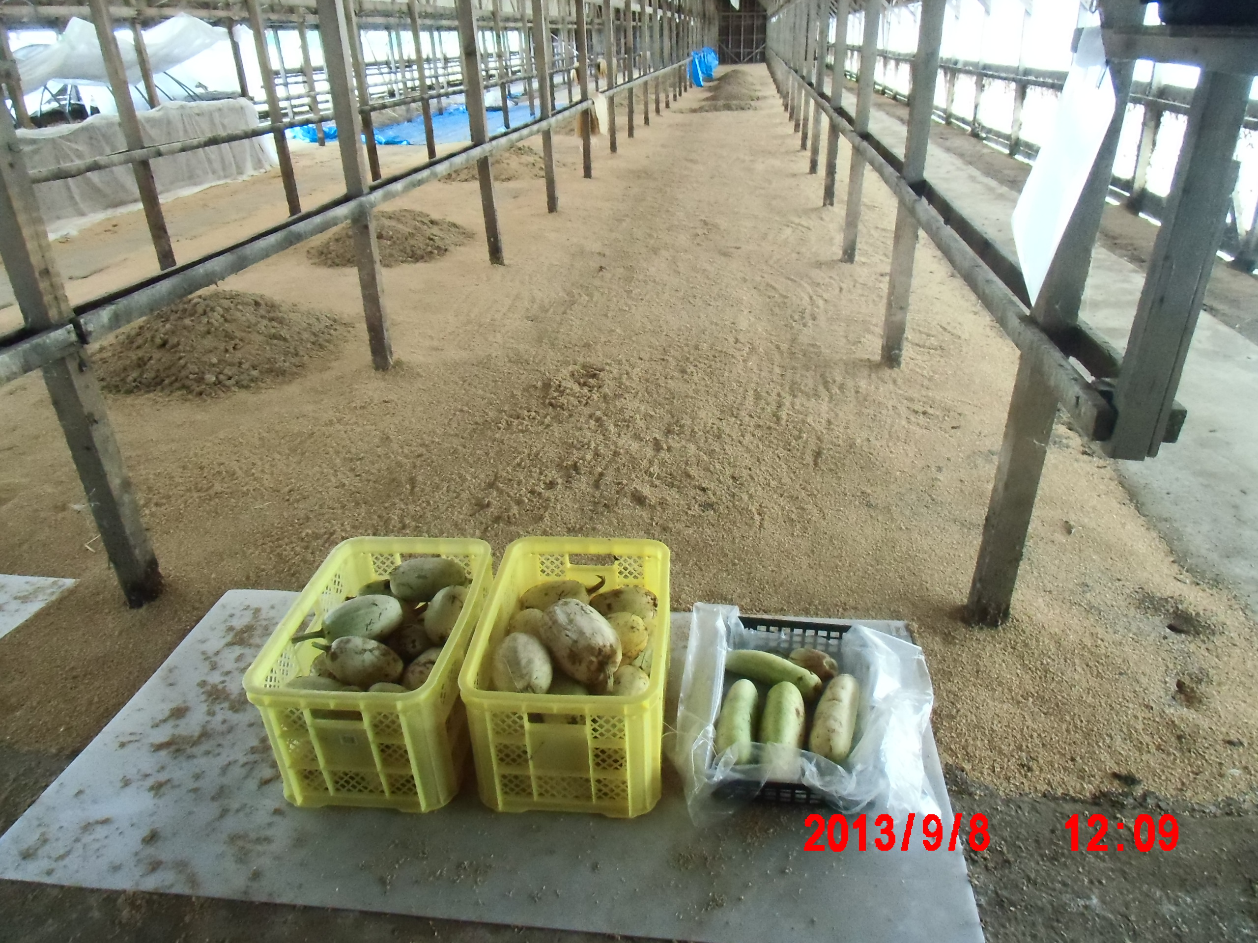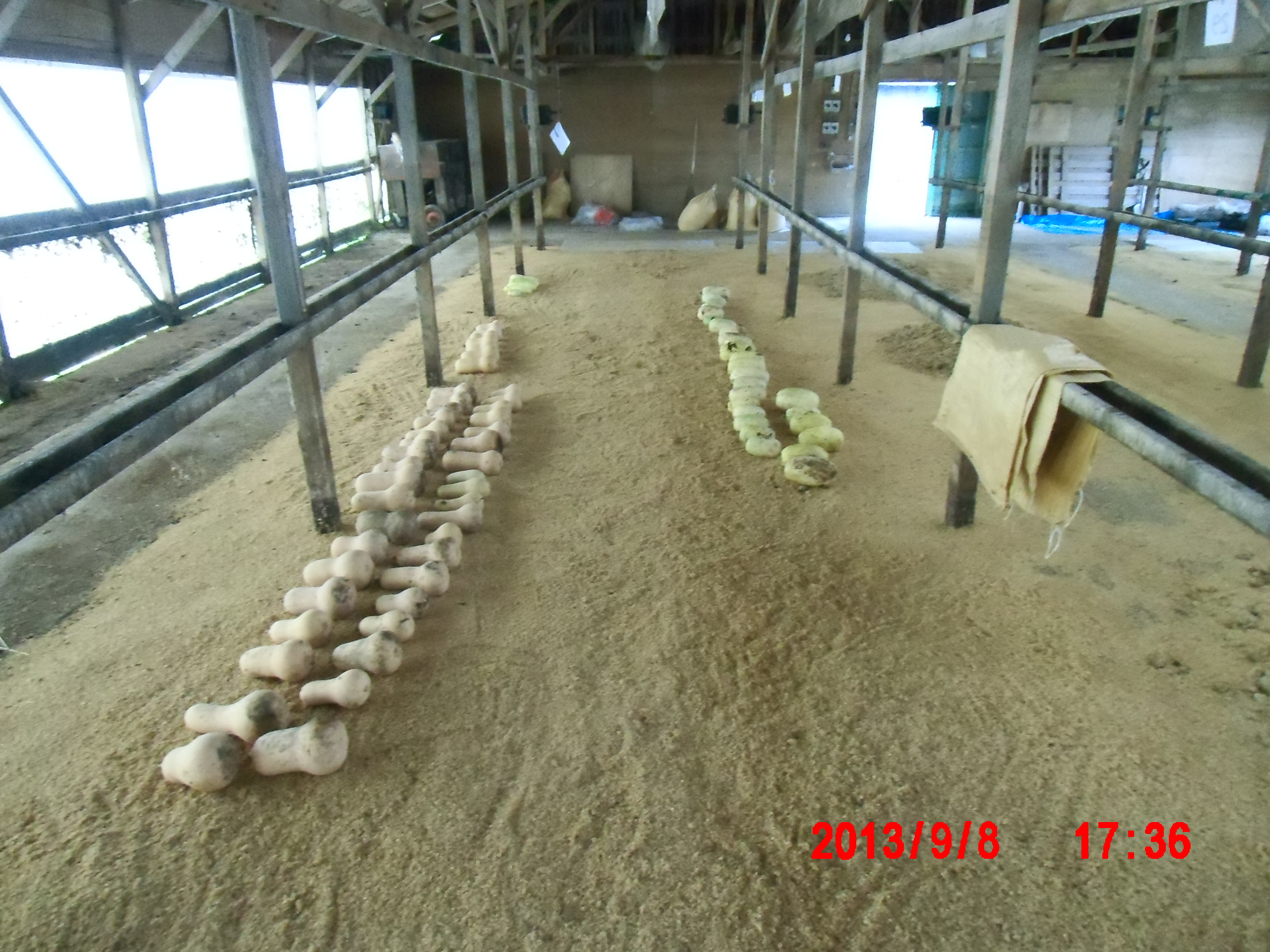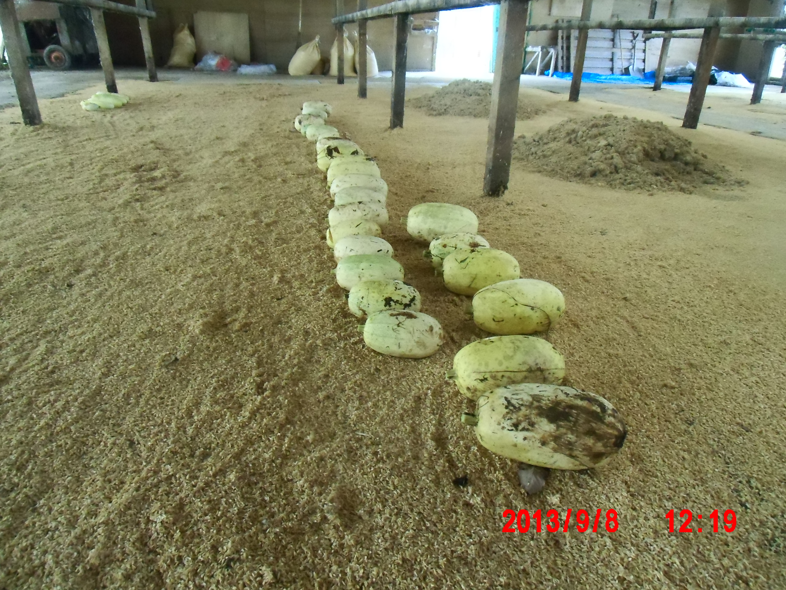 ボカシ肥料を作っている建物の中の地面にもみ殻を敷いているところに並べて追熟させることにしました。