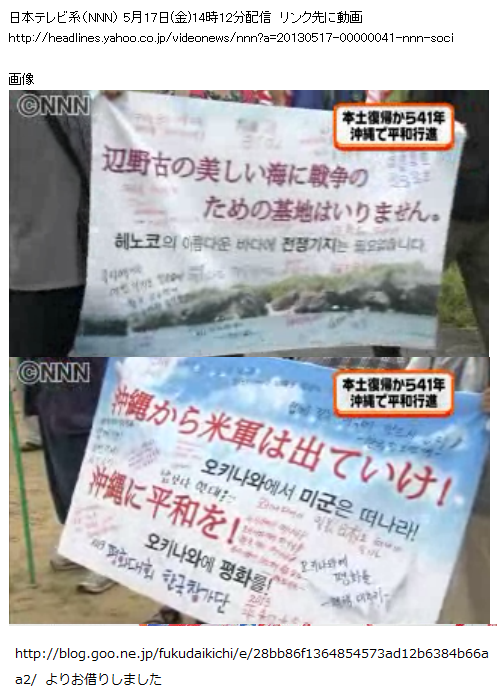 沖縄の米軍基地問題でもハングル文字の横断幕が登場してます。