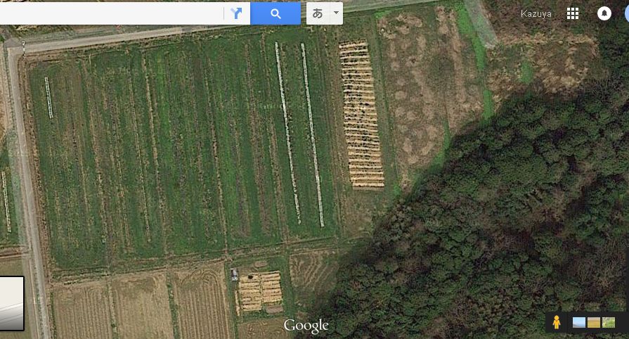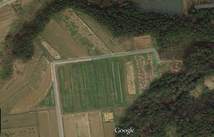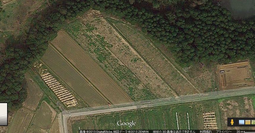 ここは中央に見える緑色の区画(50アールあります)から周囲に飛散します。今は防御用ネットを展張させる準備をしています。支柱に使う竹の方は近くの竹林の持ち主さんから切ってもいいか許可をもらいにいっているところです。ネットは250メートルから300メートルくらい必要かと試算しています。