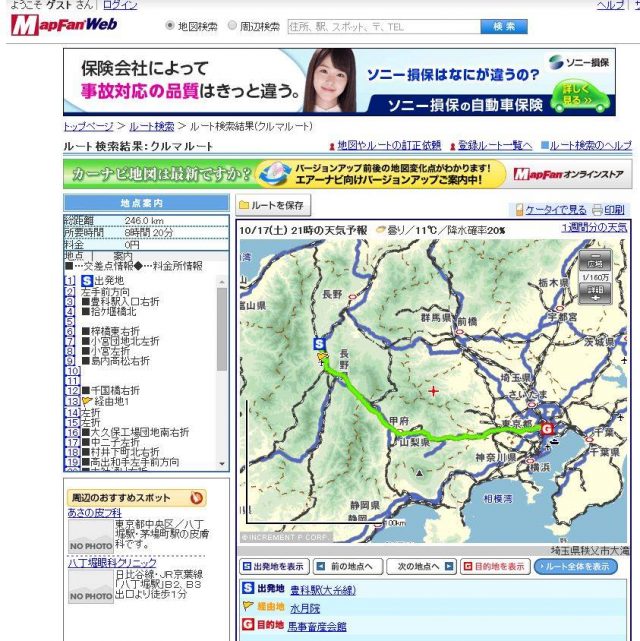 到着時間次第ですが、余裕があれば松本市近郊も回れればと思ってます。松本~諏訪経由だと中央道(ルート20号)で東京まで進みます。一般道だとおよそ250キロを8時間20分とありますが、それだと仮眠する時間がとれないので交通状況を見てどっかから高速に乗ると思います。