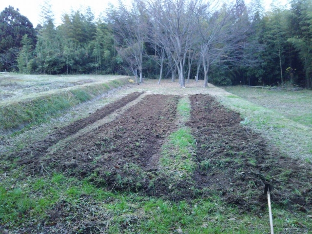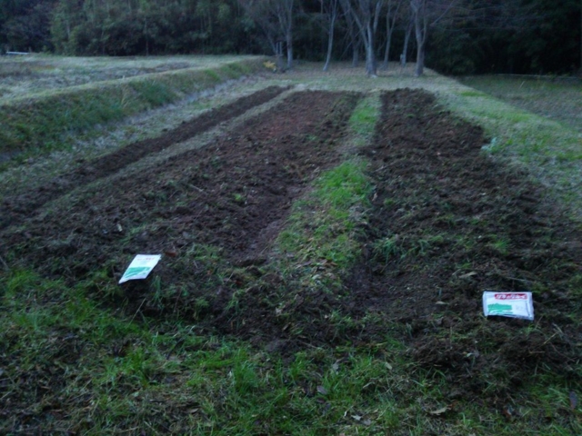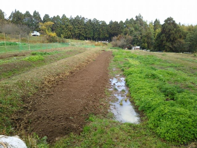 昨日は雨が降ったりやんだりしている中、どうにか30mの畝たて終わらせました。