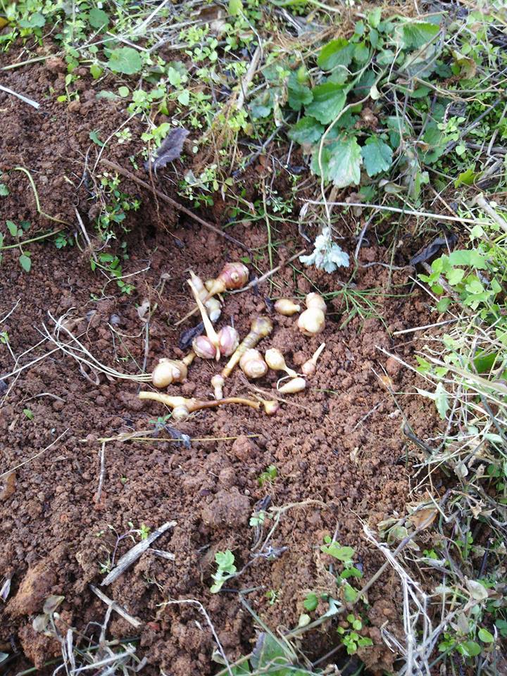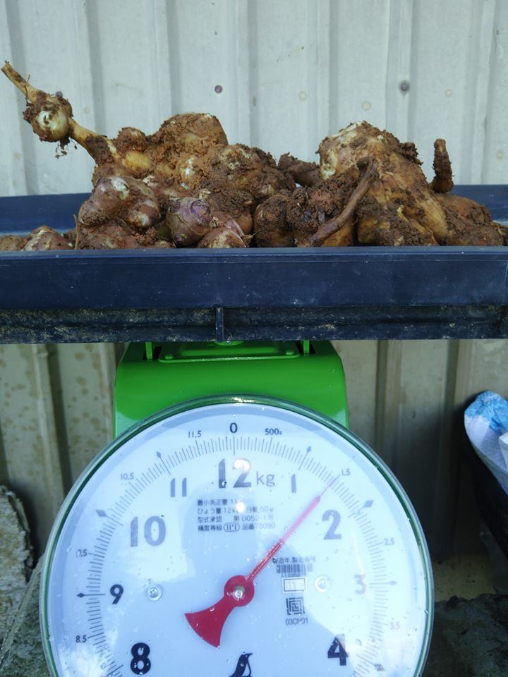 菊芋を1株試し掘りしました。化学肥料を使わないので少し土がついて900gほどの収量です。水洗いすると日持ちがしませんが今回は芋のつき具合もチェックしてます。4枚目が今の親芋の姿ですね。豆粒みたいな芋でも増えるのか調べるために埋め戻しました。