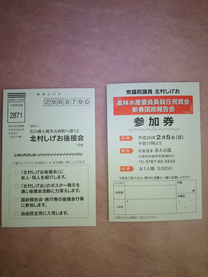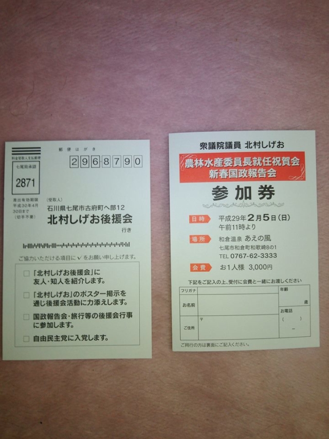 2月5日に去年9月に農林水産委員長に就任された衆議院石川県3区の北村しげおさんの国政報告会が和倉温泉のあえの風であります。私は党員なので参加しますが希望される方いませんか?