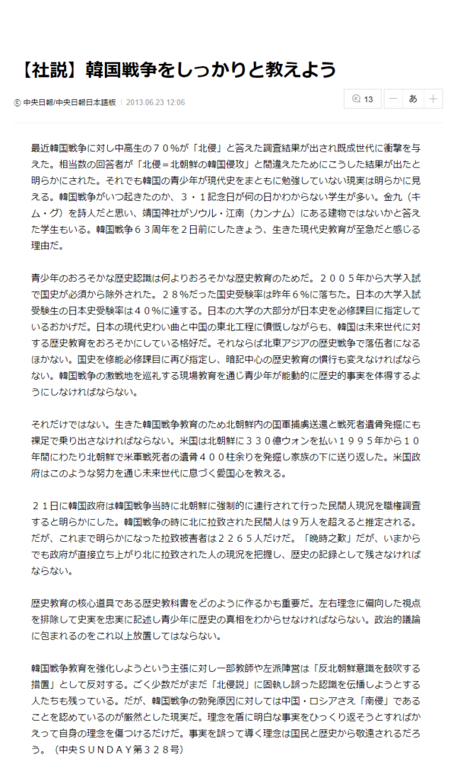 社説の内容は、なぜ起きたのか?という質問で「北侵=北朝鮮の韓国侵攻」と答えた中高生が多くいたがそれは間違いだ。という社説です。