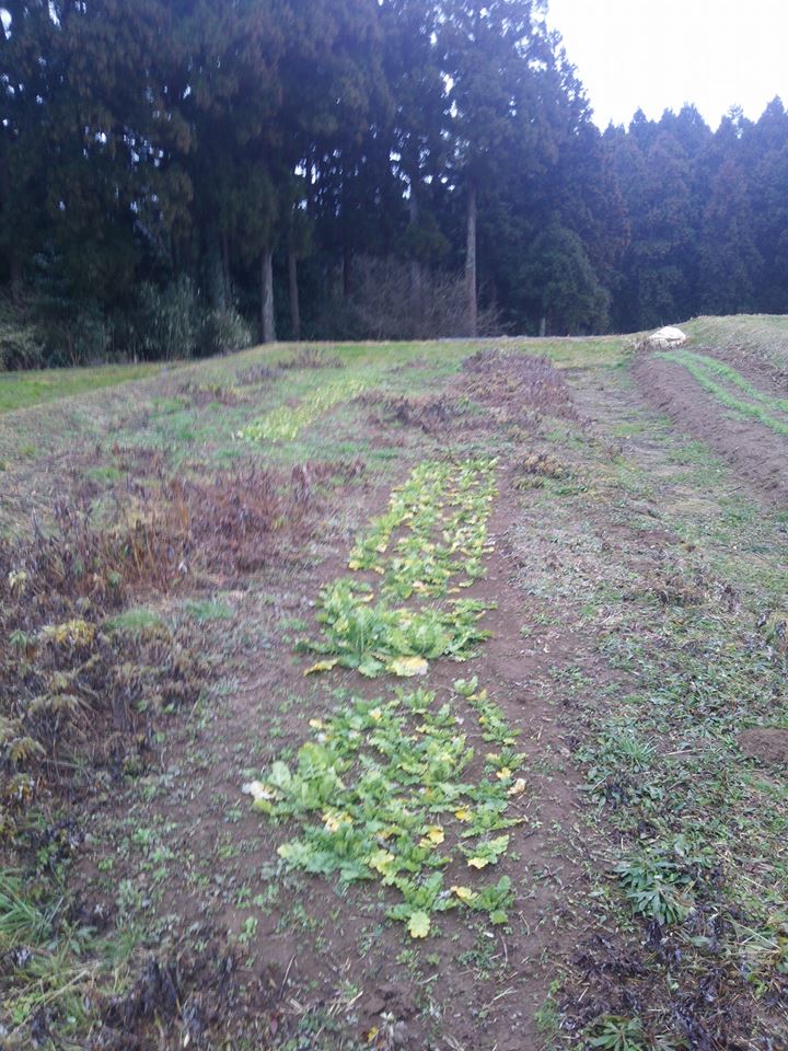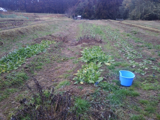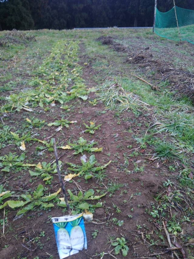 2枚目の写真は一段上の畑の親田辛味大根です。同じ栽培方法でしたが、畑というか休耕田なので場所ごとで成育状況が変わります。これを上手く調整してすでにある産地と同等の品物にしていく作業を今年からすることになります。