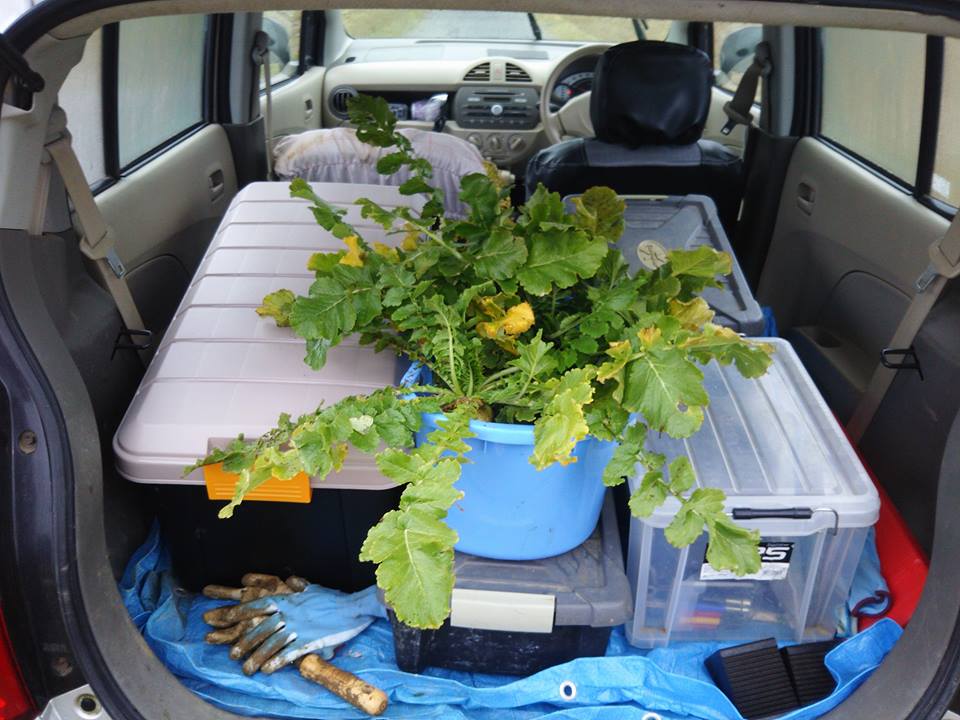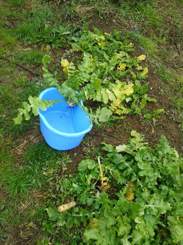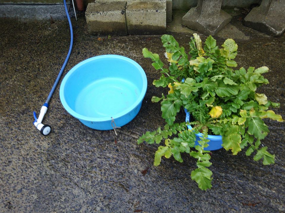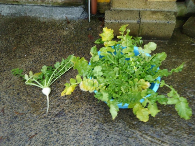 寒い日が続いているので葉を横に広げて地面にへばりついてます。辛味大根の良い点は元のサイズが小型なので収穫は楽です。一番良く出来たように見えたものを7本収穫しました。あと残りは更に小さいものが100個もとれるか?という感じです。