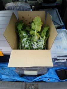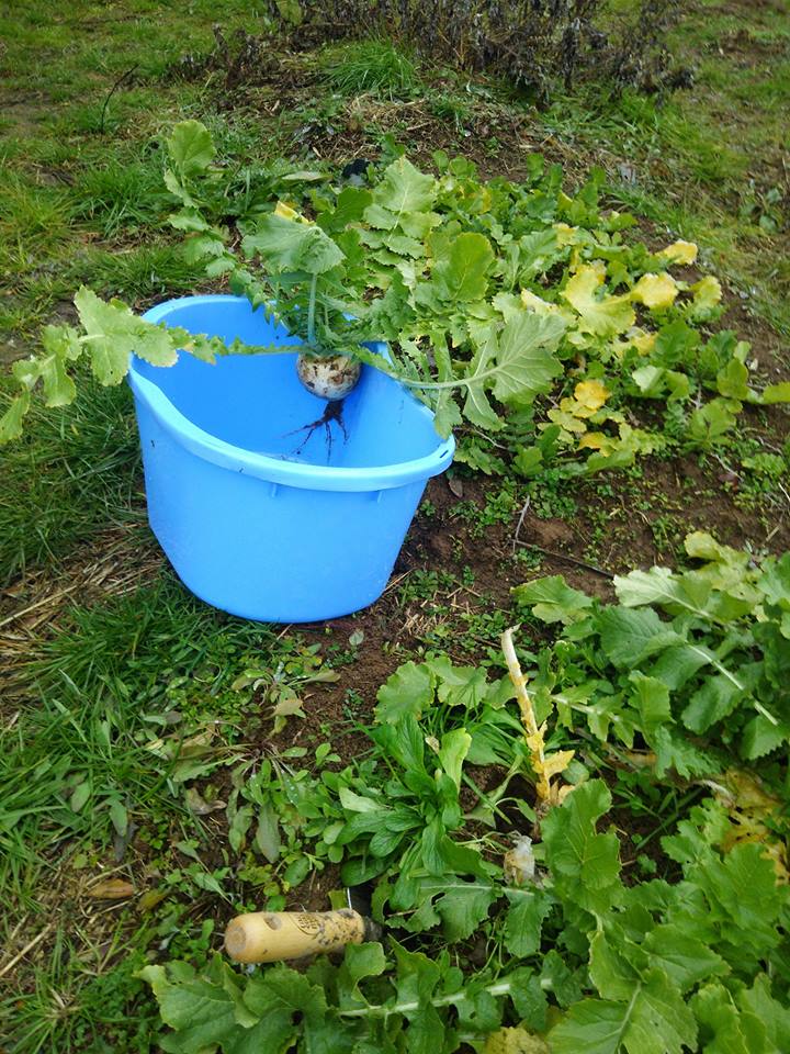 2月に入ってからの収穫は遅いかもしれません。割れているのが1個ありました。適切な収穫時期も考えてみます。金沢の市場に「能登の食材」で出荷しようと思えばできますが、その場合は葉は10cmほど残してカットします。これは用途が大根おろし用なので。この大きさだと値段は他の産地の標準品との比較になるので、たぶんつかないと思ってます。下手すると手数料やらなんやらで赤字かも。でも需要があれば生産可能です。