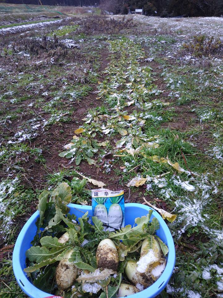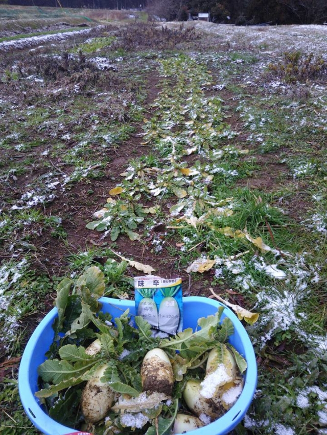 今日は小雪が 舞ってます。味辛という宇治交配種の辛味大根を収穫しました。