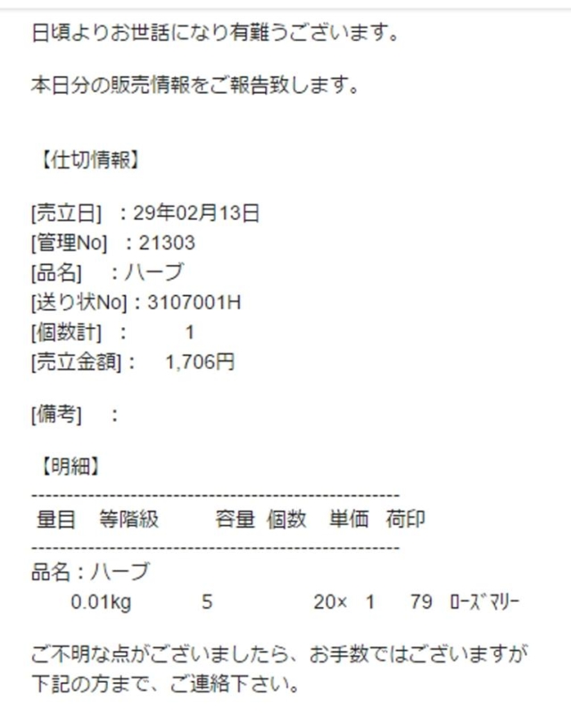 ローズマリーは1パック79円、葉ニンニクは1袋29円で仲卸さんに買っていただきました。