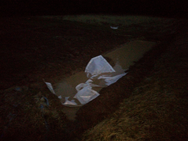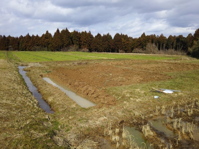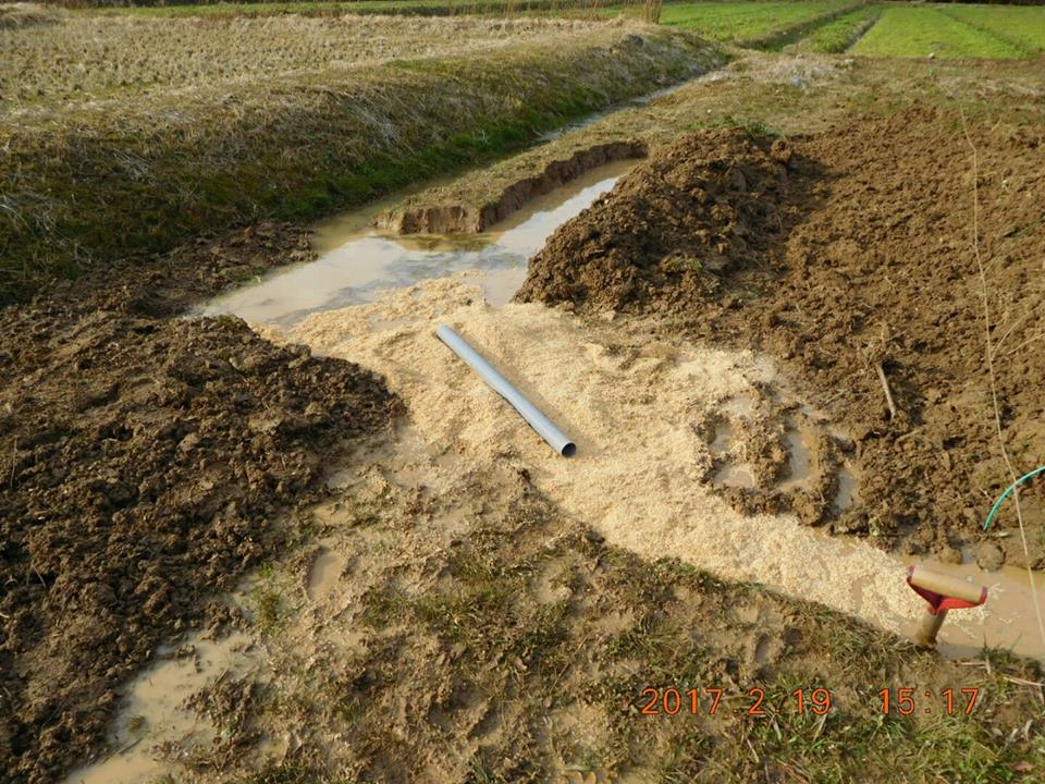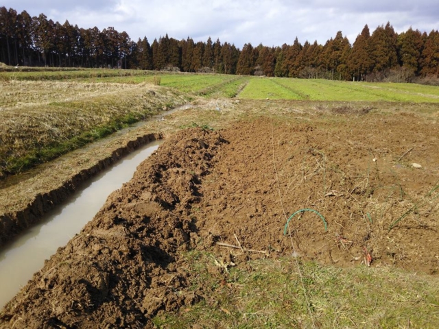 今日のところはシートが風で飛ばないように水の中に入れて終わりました。4m地点に暗きょ1本もみ殻とパイプで構築。法面のすぐ下に掘った排水溝を盛り土をしてずらしました。最初は気づかなかったんですが、それだと草刈りしたら刈った草で溝が埋まってしまって失敗したと思ってました。あと半日で終わらせる予定です。ちなみにすぐ上と横の水田は高尾みそ屋さんの借りている田んぼです。