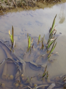 子どものさぎがカキツバタのそばで餌食べに来た-2017-03-17