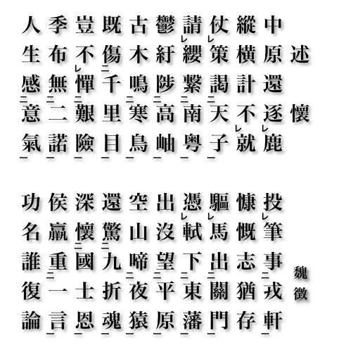画像と読み下し文は、漢詩作法入門講座より借用しました。出典は『唐詩選』。作者は魏 徴(ぎ ちょう、580年 – 643年)という唐初期の政治家です。述懐 (じゅっかい)という五言古詩です。この漢詩は最後の二行が有名です。