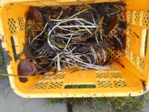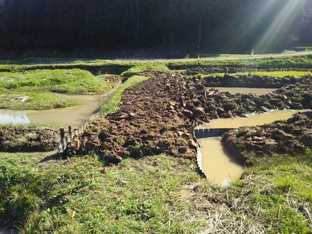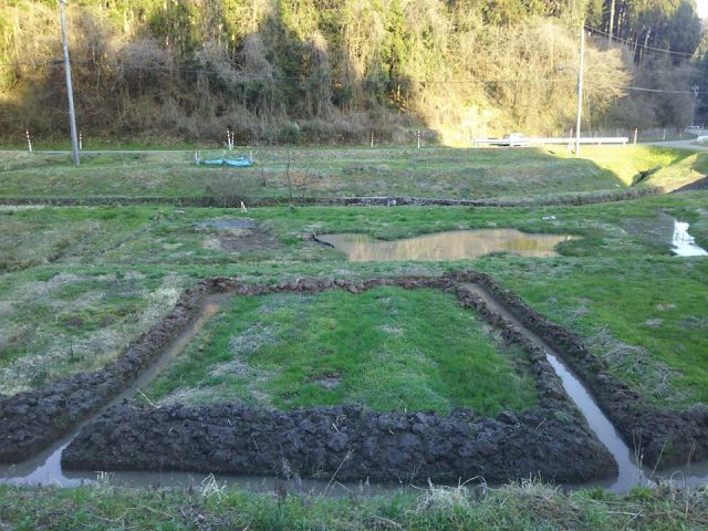 溝堀り作業は終わったかな?これで用水からメダカ、ドジョウ、八つ目うなぎ、鮎などが流れてきても水があふれたり干上がらなければ循環出来ると思う。アピオスは放任栽培だったのであちこちに広がってます。2kg購入から始めましたが、かなり種芋ができたと思う。