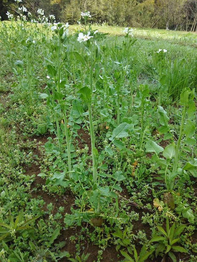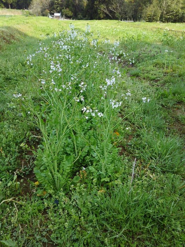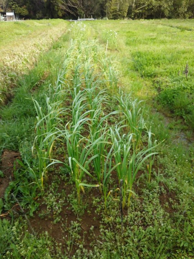 辛味大根とビタミン大根の花が咲いてます。上の写真から、辛味大根の「味から」は春まきできるので花は1株だけ。二枚目が「からいね白」、三枚目が在来種の「親田辛味大根」、四枚目の白い花が固定種のビタミン大根(青長大根)。在来種と固定種は種取りできますが、さやをすずめが全部食べちゃうから種取りが難しい。最後の写真は葉ニンニクです。やっと大きく育ちましたが、いつまで食べれるのか自分が分かってないので調べてます。とうは立てません。