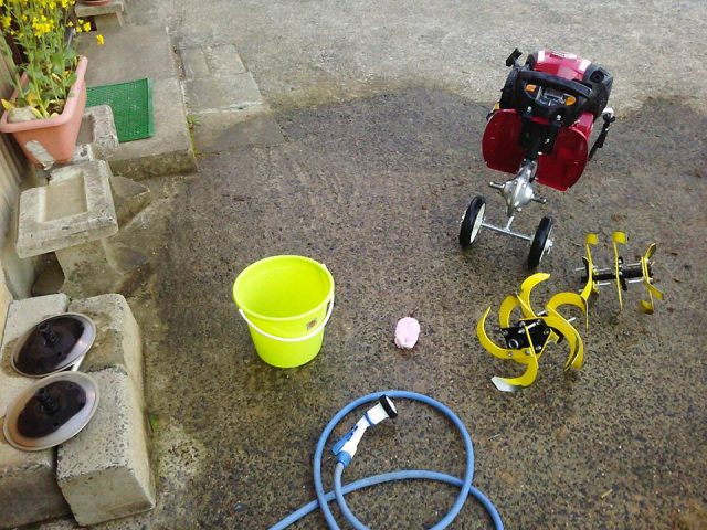 作業後のミニ耕うん機はパーツをばらして丁寧に水道で洗浄しました 2017-04-22